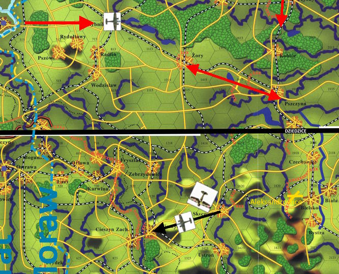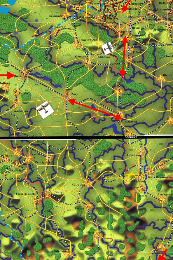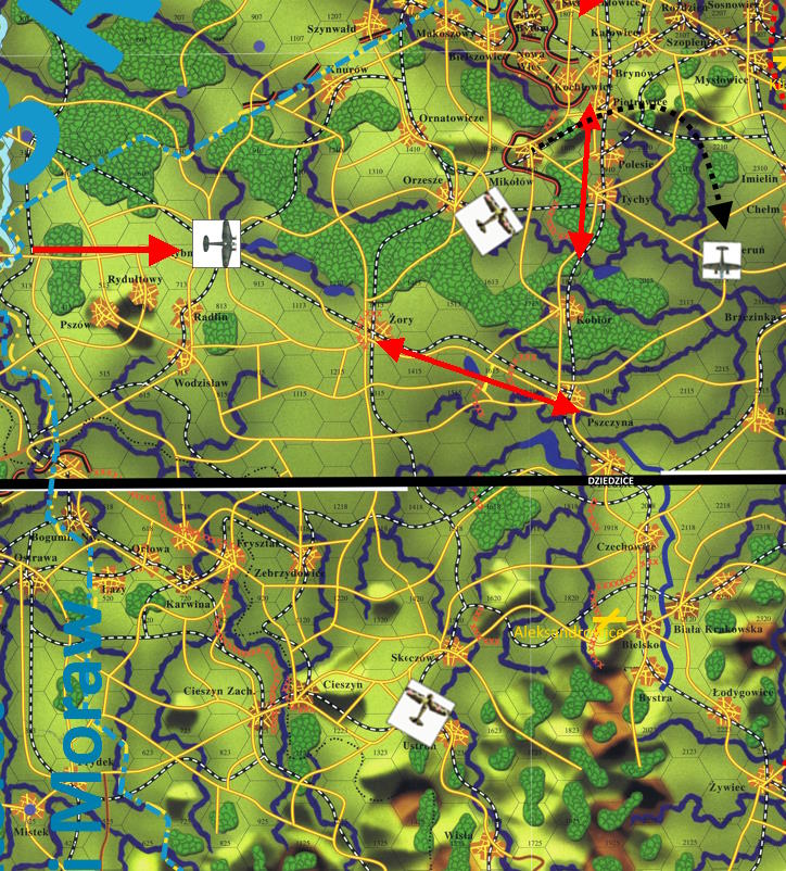 - Mamy formację bombowców nad 08-12 [Rybnik]. Nad chmurami, kierunek wschód. - to brzmiało jak Deja Vu. Niemniej Bronek nie zapomniał o poprzedniej formacji- Druga formacja zaatakowała 19-09 [Katowice], wraca pod chmurami, kieruje się na 22-13 [Bieruń]. Połączcie się z kluczem 1 na 19-17 [Dziedzice], celem wspólnego ataku.