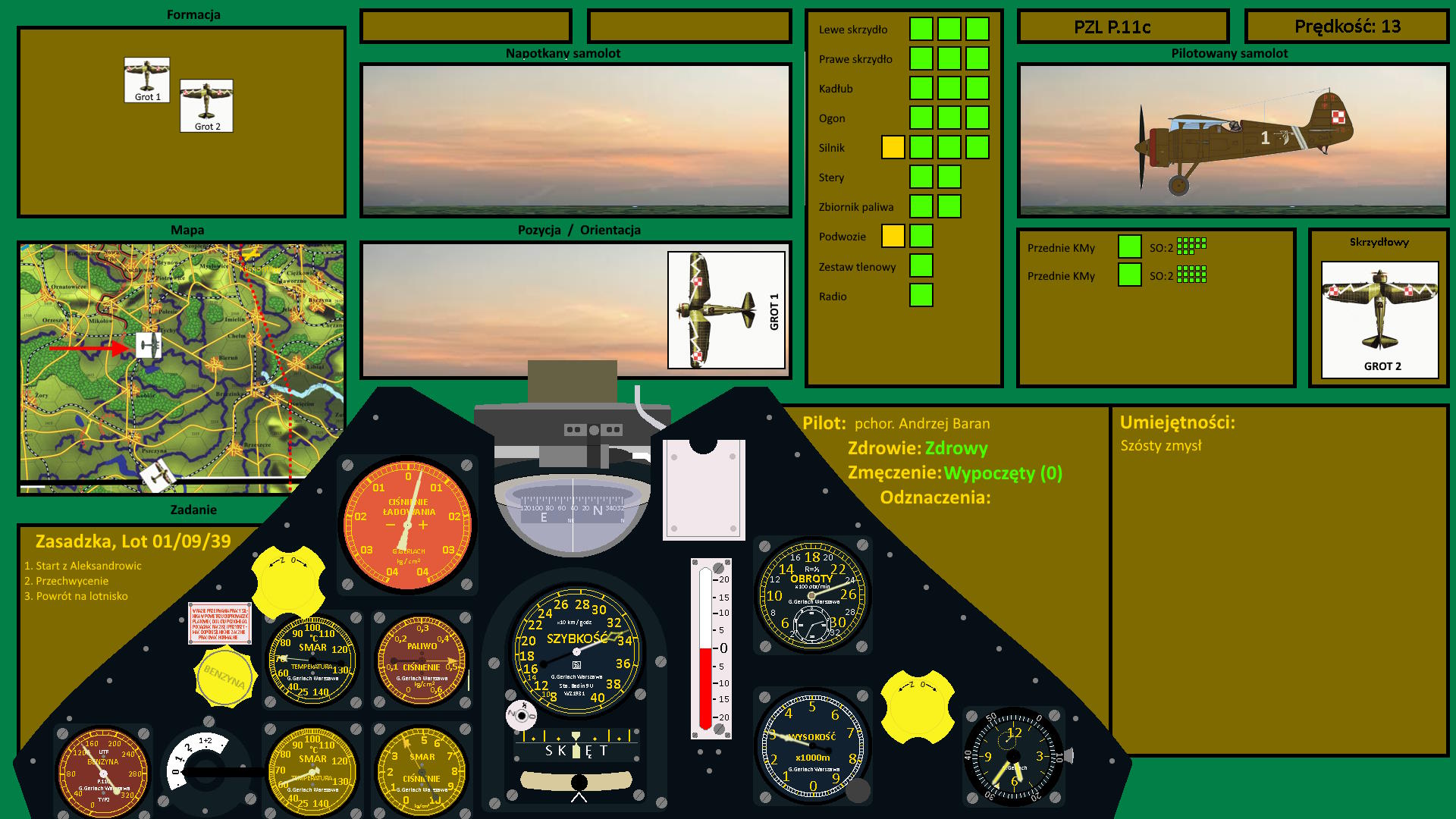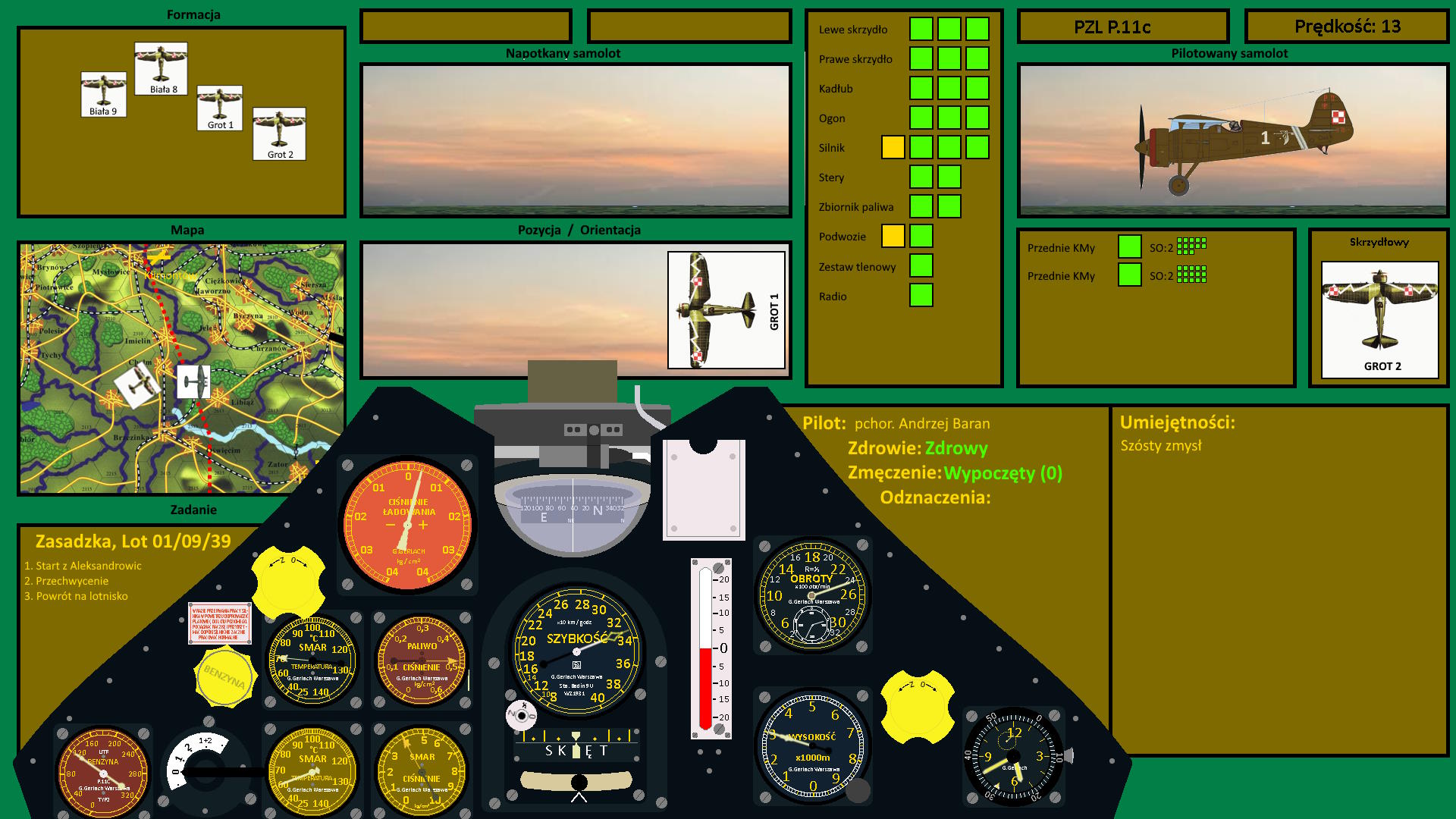 Gdy zbliżali się do Chełma, kończyły się chmury, które gęsto zalegały nad Beskidem, tworząc bardziej porozrywany obszar nad Małopolską. Rozglądali się wokół i nagle Andrzej dostrzegł ciemne kropki na tle ziemi, poruszające się niżej od nich. To była jakaś formacja... Kilkanaście maszyn, kierujących się na wschód, to był na pewno przeciwnik, którego ścigali. Andrzej rzucił szybko okiem na wskaźnik paliwa. Miał paliwa na około 30 minut z czego 10 minut trzeba było poświęcić na powrót do bazy...