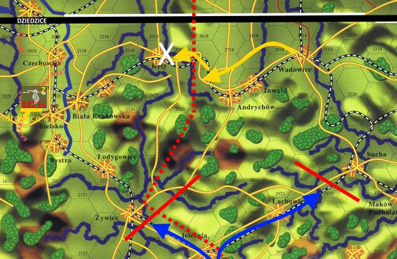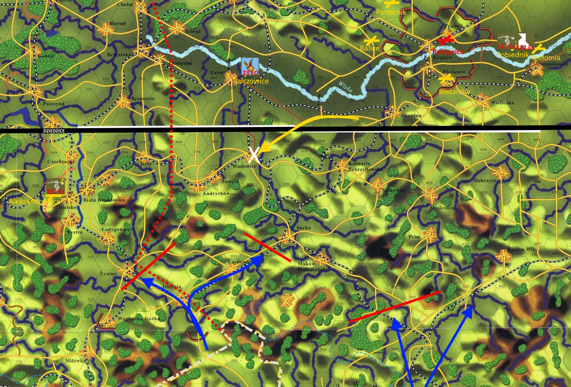 -Jesteśmy tu, wróg naciska tutaj... Widzę dwie drogi. Większe koło przez Zator, albo odbijemy trochę na północ i przez wioski postaramy się dojść za Andrychów... Nie uśmiecha mnie się tutaj czekać, gdy jesteśmy godzinę drogi od Bielska.