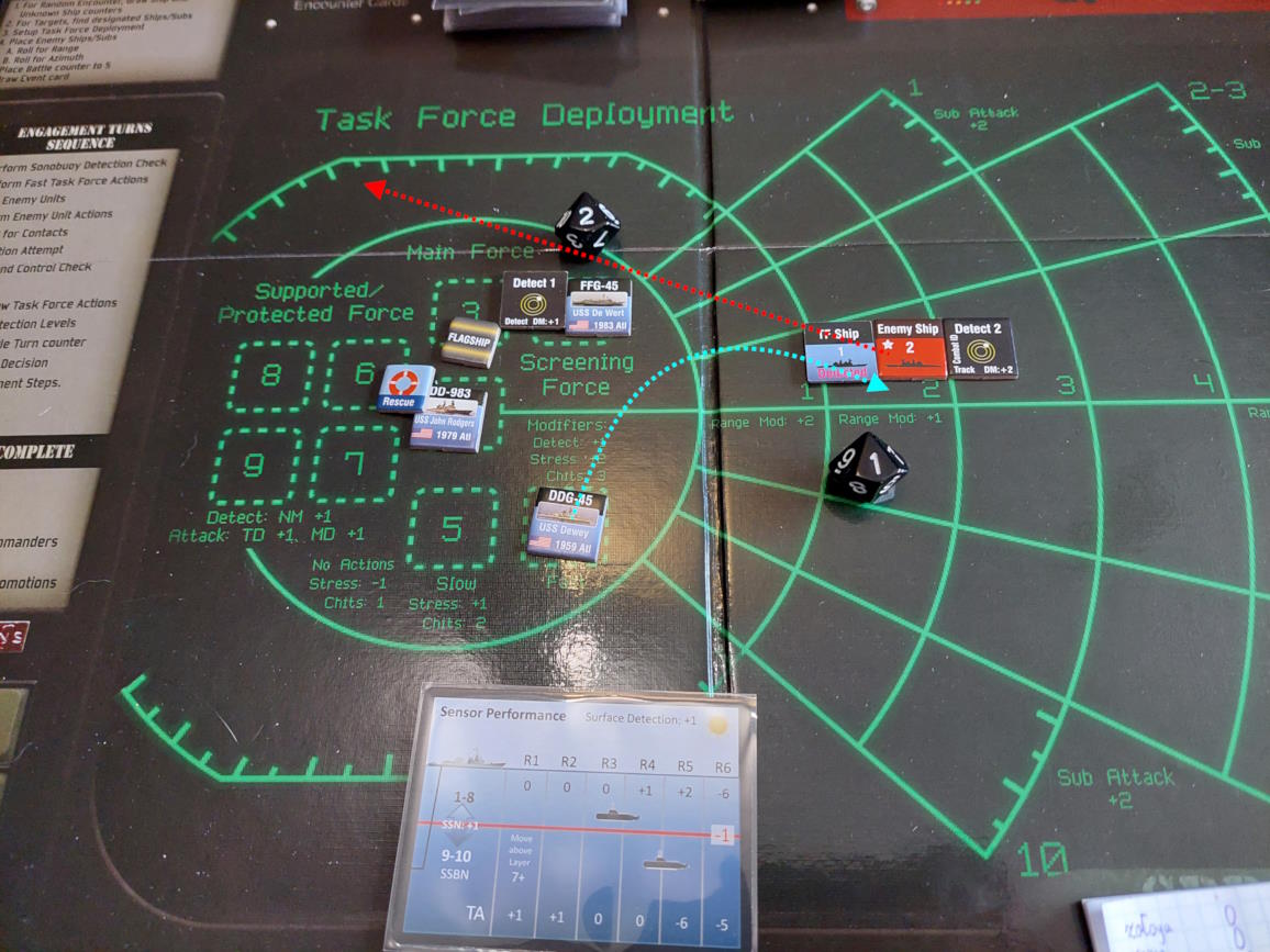 ... gdy nawiązano kontakt z wrogim zespołem. Akcje szybkie dowódcy: 1 - zbliżenie, rzut na chorobę udany, akcje okrętów szybkie (osłona) - rozpoznanie celu -> Uzyskano kontakt z nierozpoznaną jednostką [pogoda uniemożliwia osiągnięcie pełnej identyfikacji kontaktu. Przy 1k10 kara za pogodę wynosi 3, a rozpoznanie wymagałoby wyniku 9, przy najlepszej załodze mogącej dodać +1 do rzutu