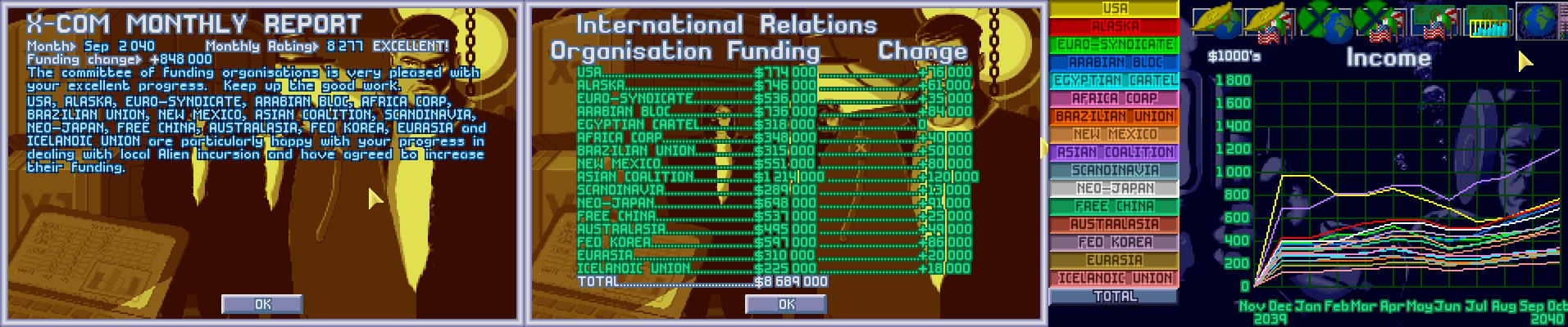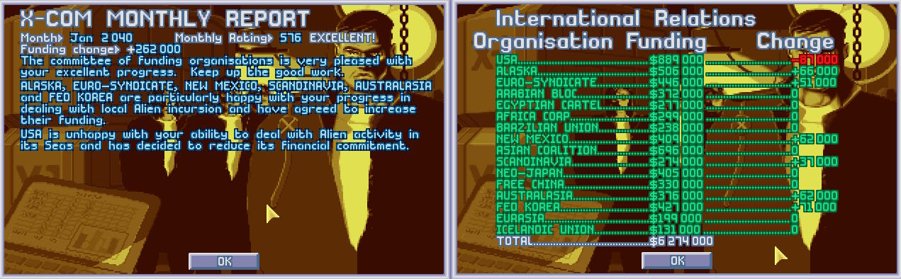Cała rada jednoznacznie pochwaliła skuteczne działanie X-COM zwiększając finansowanie projektu. Nawet USA, tak oporne w finansowaniu projektu postanowiły zwiększyć finansowanie ponad Koalicję Azjatycką, ale Koalicja również postanowiła zwiększyć finansowanie, co prowadziło do zwiększenia finansowania o ponad 600 000 $.