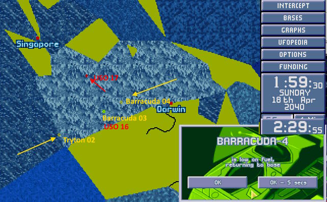W bazie na oceanie indyjskim otworzono nowy zestaw sensorów, gdy napłynęły meldunki, że na Morzu Jawajskim zauważono USO. Dowództwo ponownie nakazało wysłać Barracudy 03 i 04 na przechwycenie. O 17:30 sensory dalekiego zasięgu z bazy X-COM numer 2 wykryły USO, gdy to wzbiło się w powietrze, aby przelecieć nad Indonezją. Barracuda 03, jako znajdująca się najbliżej miała największe szanse na przechwycenie nieprzyjaciela.