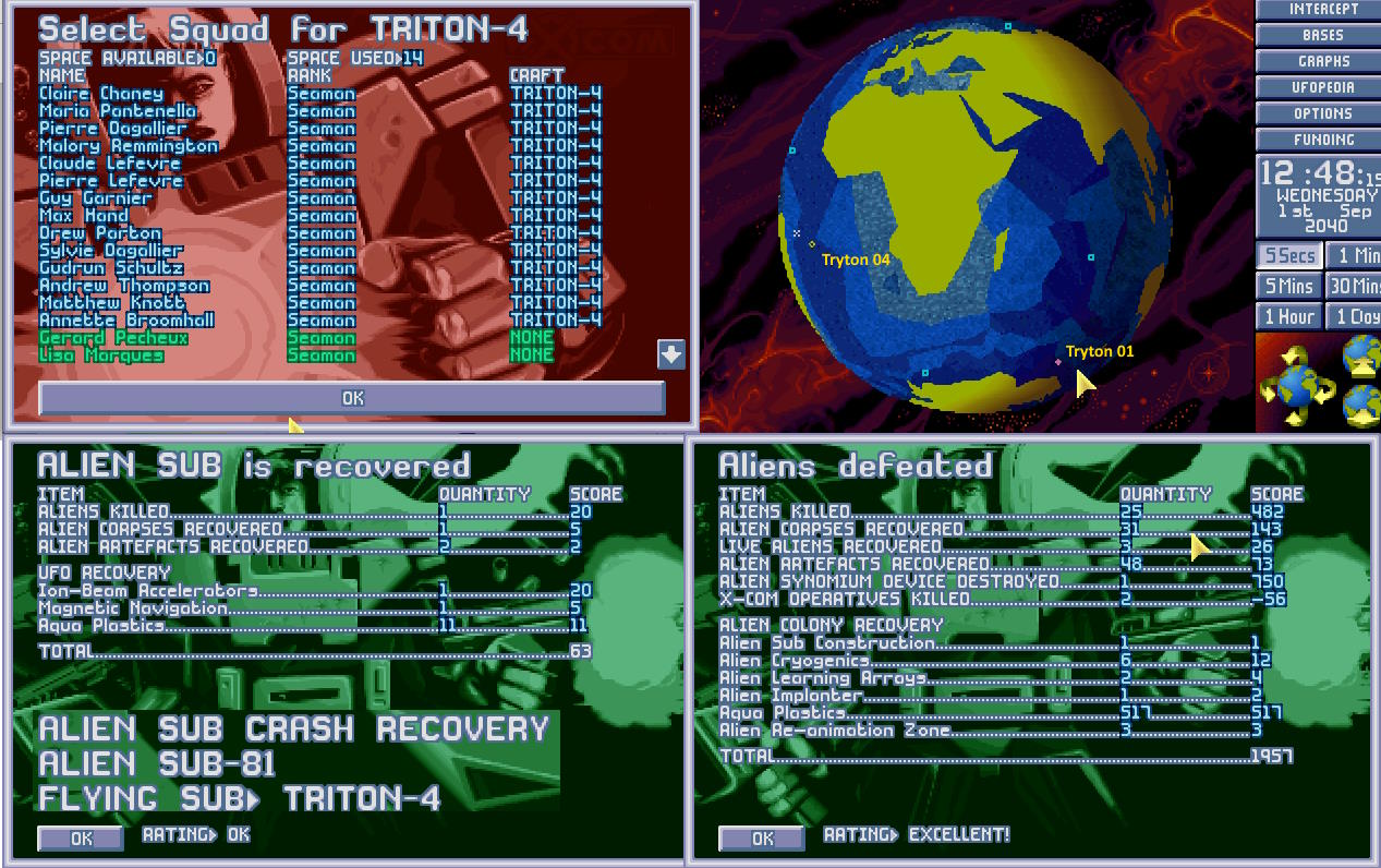 Tryton, łódź transportowa X-COM dotarła nad ranem w pobliże miejsca zatopienia, gdzie wdała się w walkę z obcymi. Dieter Hofner dostał zaszczyt bycia pierwszym Aquanautą, który zabił obcego, a Stefan Berger zdobył niechlubny zaszczyt bycia pierwszą ofiarą reaktywowanego projektu X-COM...