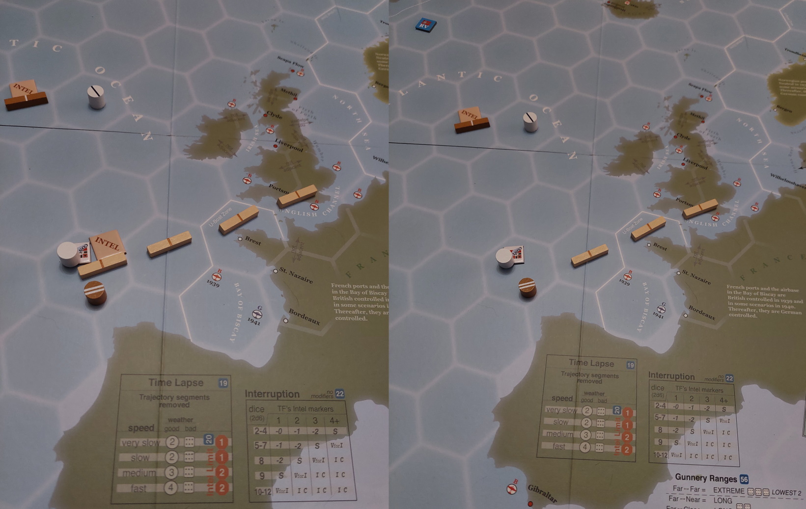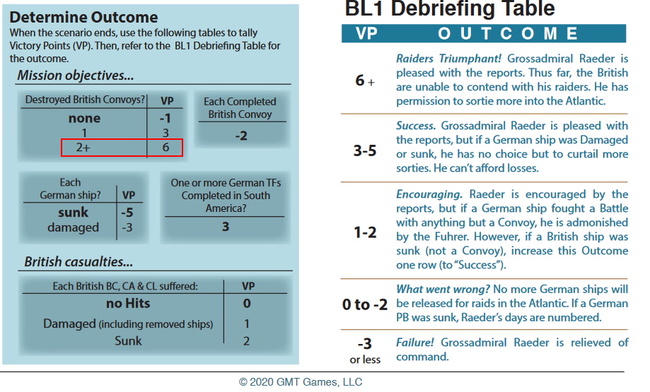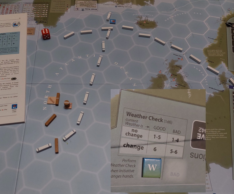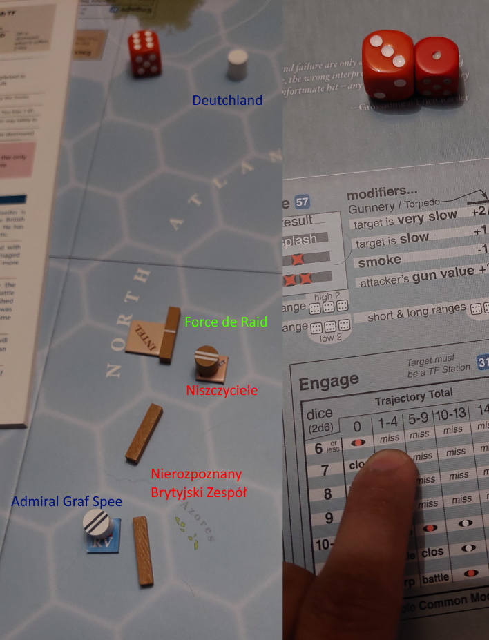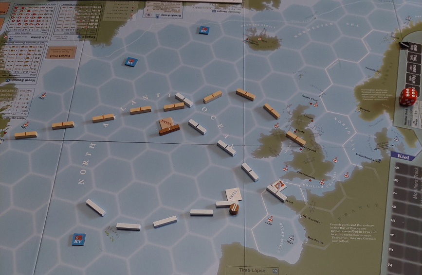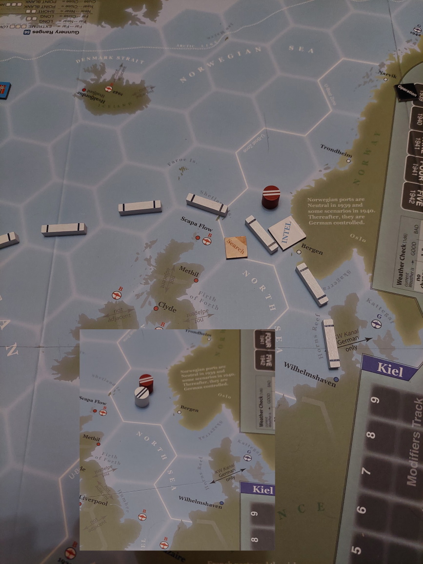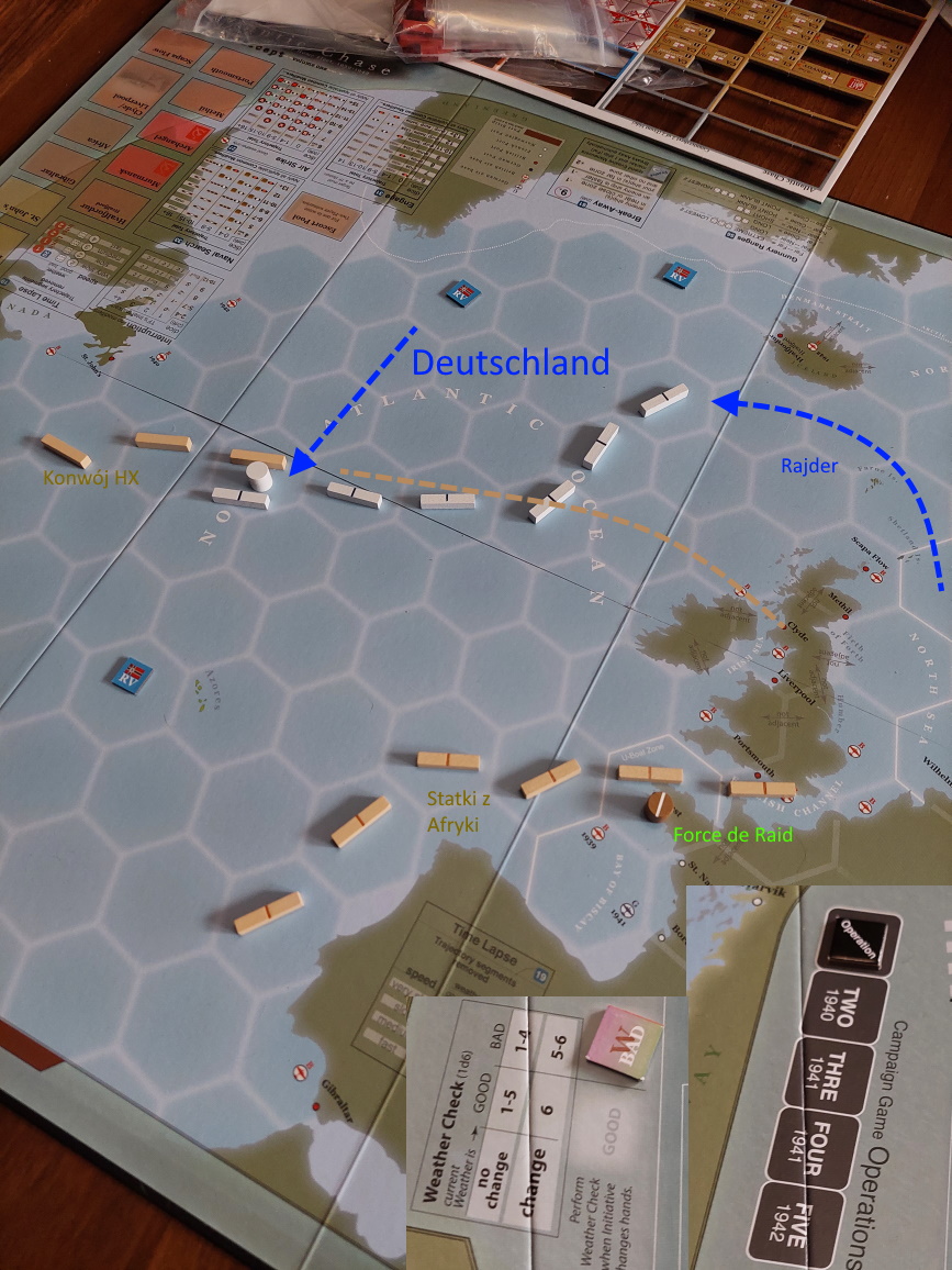 Tura 1: Gracz Niemiecki wyznacza kurs Rajdera oraz Deutschlanda do trasy konwoju HX. Gracz wykonuje test posiłków - nieudany. Graf Spee niedostępny, Brytyjczycy przejmują inicjatywę. W fazie skracania, gracz rusza Rajdera pod Norwegię.