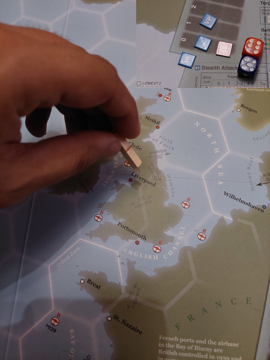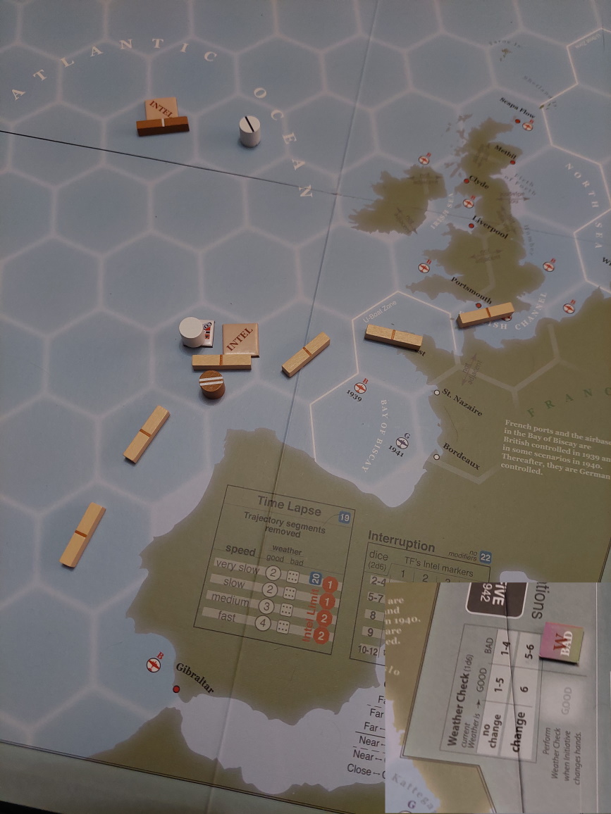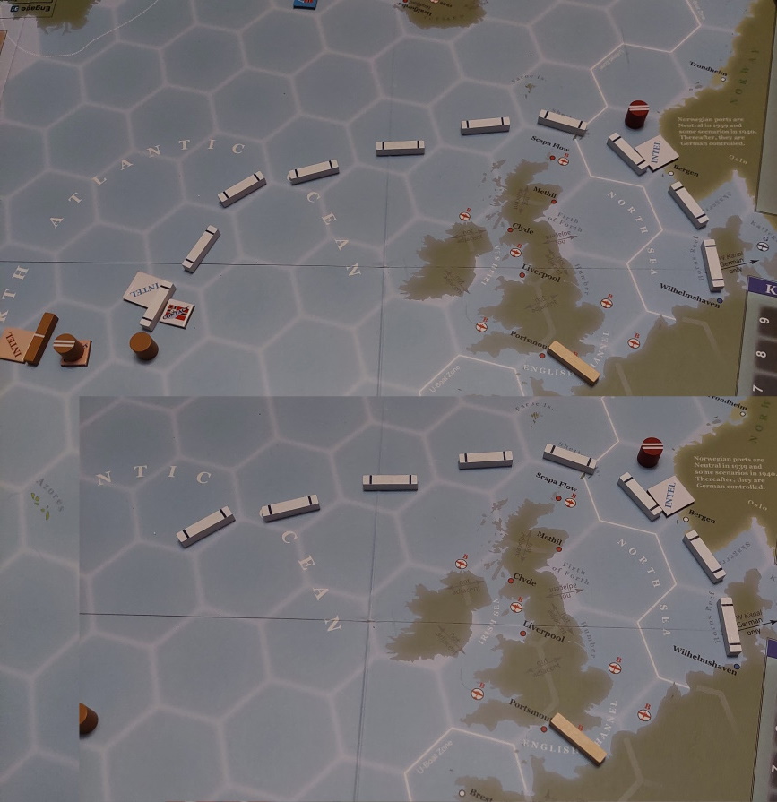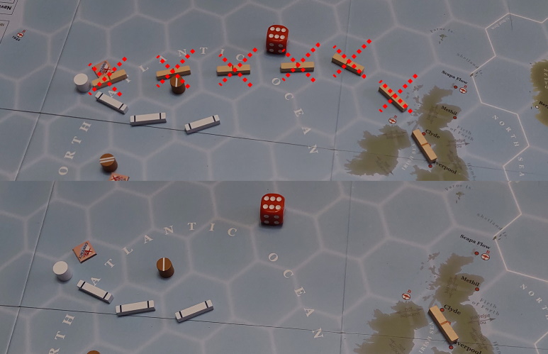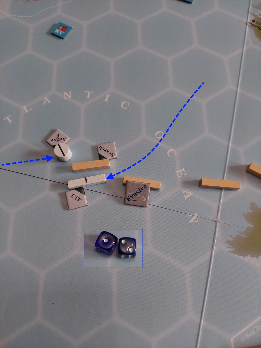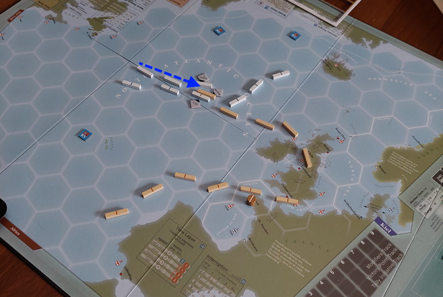 Gracz Niemiecki wykonuje akcję namierzenia i sprowadza trajektorię konwoju do punktu. Niestety, Brytyjczycy przejmują inicjatywę.