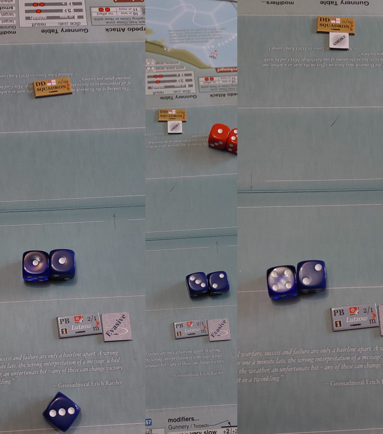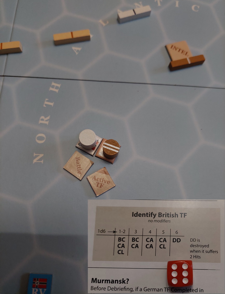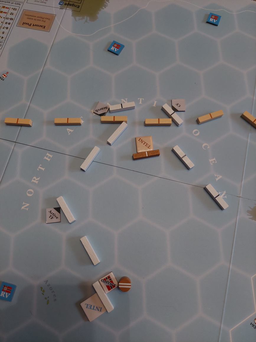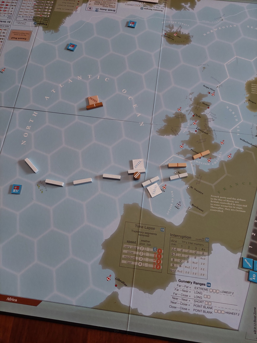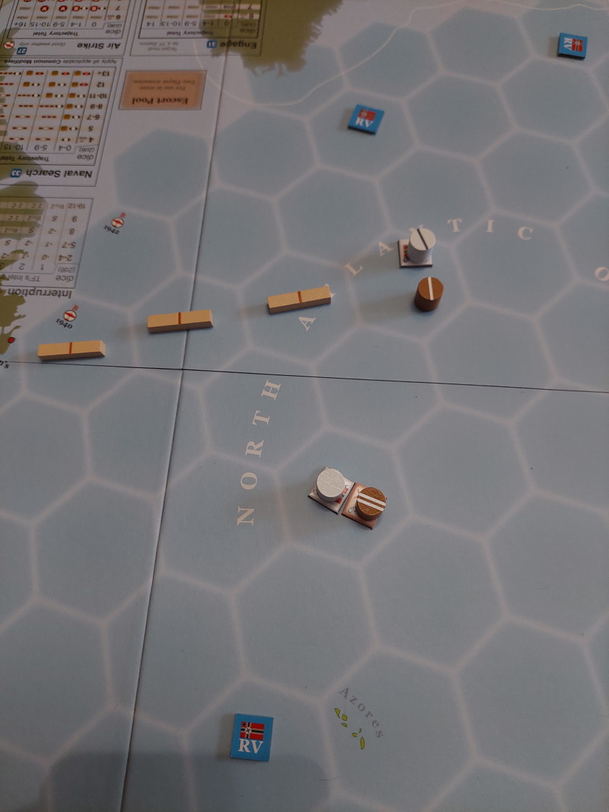 Małe wyjaśnienie. W tym scenariuszu, gdy Niemcy zatopią 2 konwoje, dostają maksimum punktów za przerywanie szlaków. Teraz mogą dostać punkty tylko za zatopienie lub uszkodzenie wrogich krążowników/pancerników... To po co narażać się? Zwłaszcza, że 3 krążowniki siedzą mnie cały czas nam ogonie