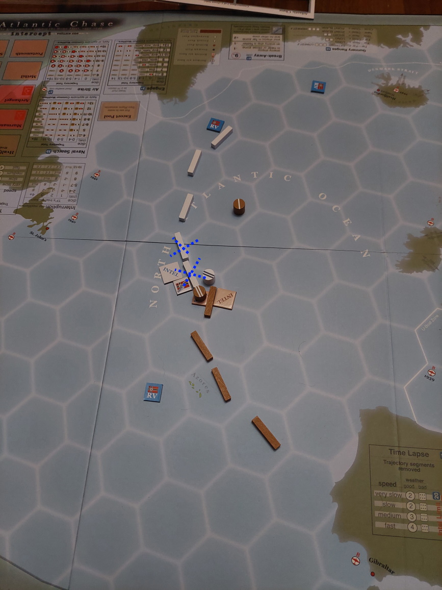 Tura 7: Inicjatywa Niemiecka. Gracz wyznacza trajektorię do konwoju południowego (i błędnie umieszcza znacznik "Intel"). Rajder prowadzi poszukiwania wroga.
