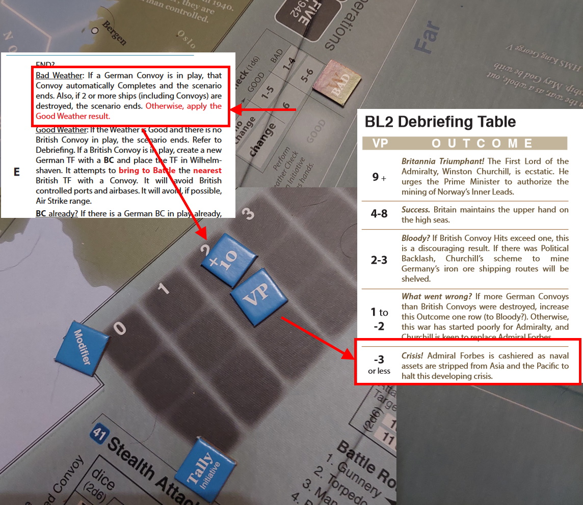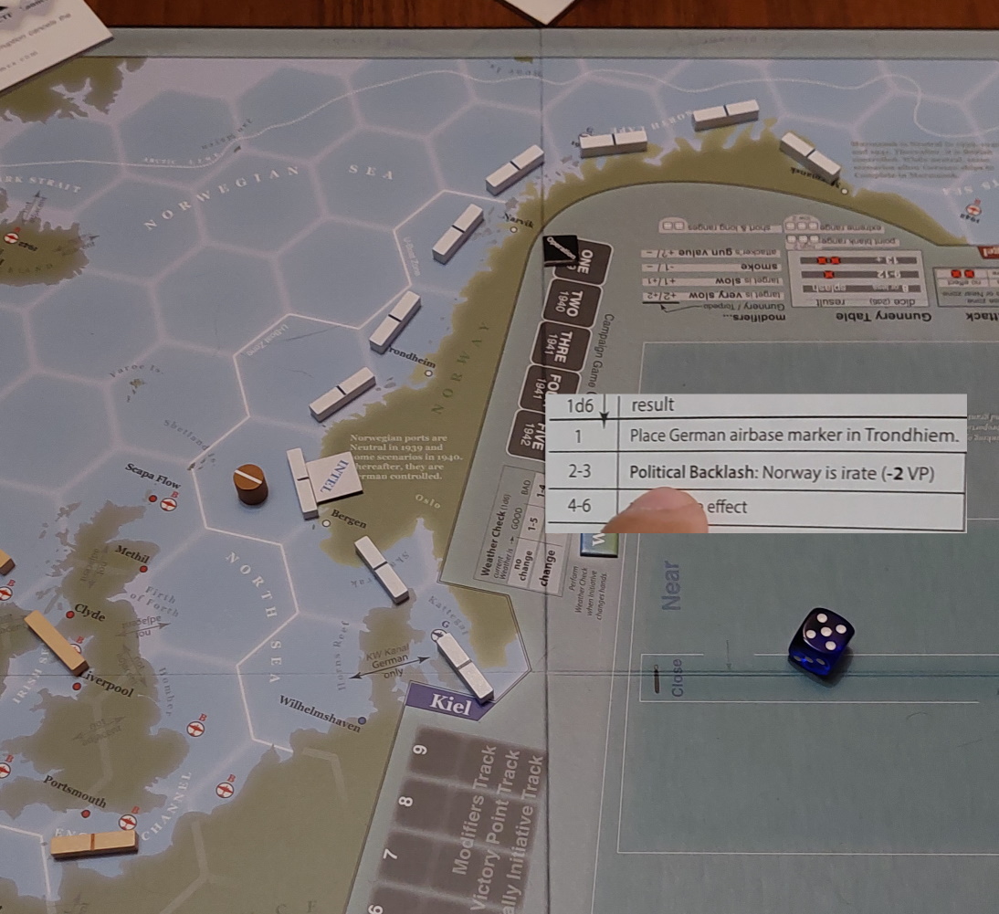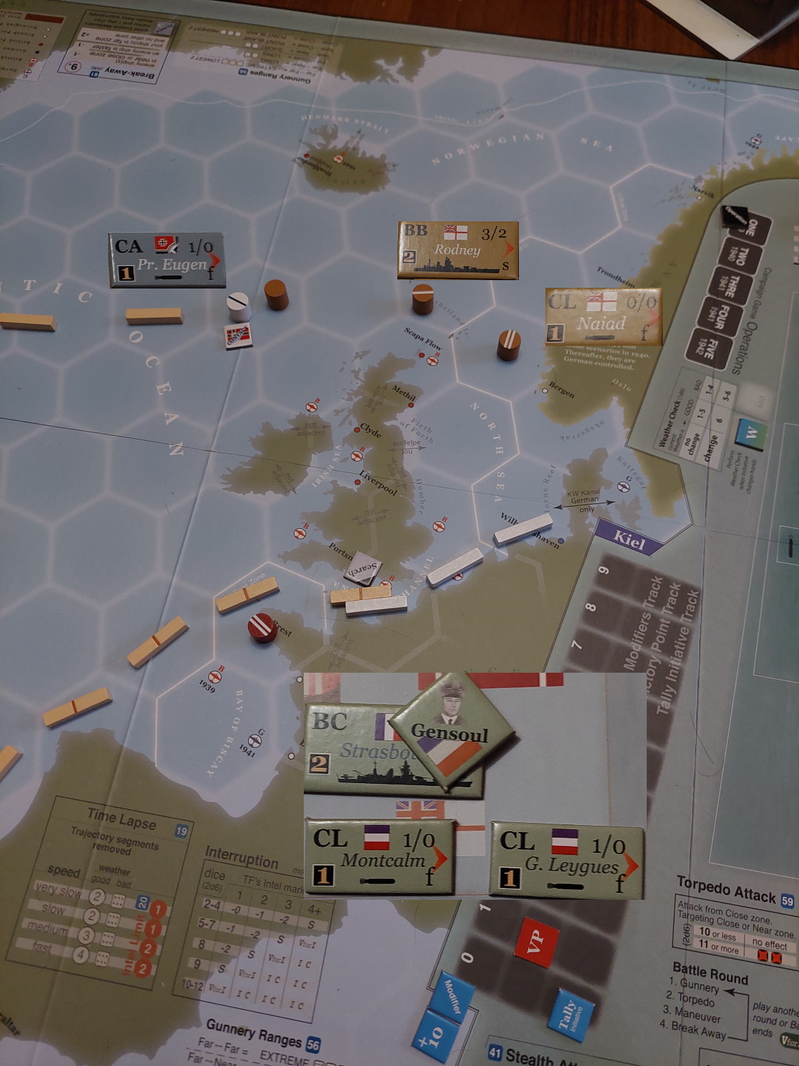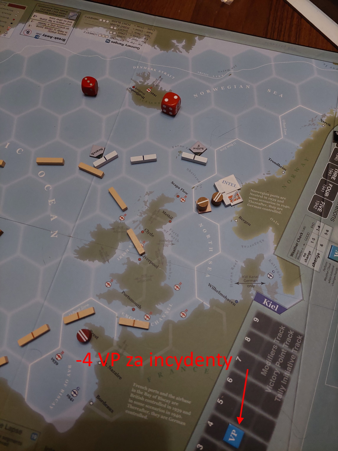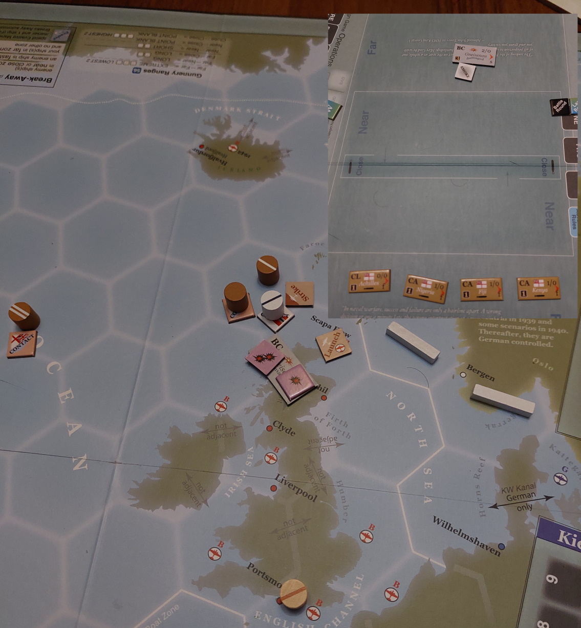 2 Eskadra Bojowa odnalazła okręty na Norweskich wodach. Okazało się, że to nie szukany pancernik, a Norweski patrol. Są mocno niezadowoleni z obecności naszych okrętów na ich wodach (a o Niemcach nie mieli). Ruszamy nasz zespół pomiędzy Wielką Brytanię i Islandię.