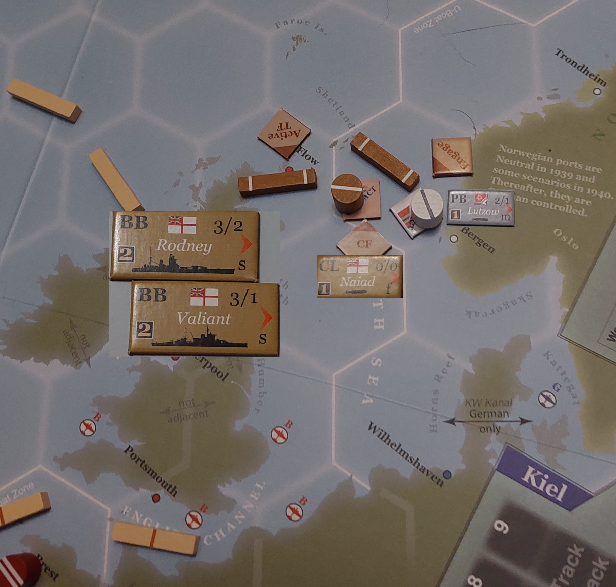 Gdzieś na Atlantyku są Niemcy, jak również w Niemczech... Statki Niemców będą przebijać się do domu, okręty próbować wyjść w morze. Największy problem sprawia Norwegia. Będą chcieli na pewno tamtędy przebijać się na Atlantyk i z powrotem. Pod Norwegię wysyłamy zespół z lekkim krążownikiem Naiad*, ja wyprowadzam 1 Eskadrę Bojową (krążownik liniowy Repulse i grupę krążowników) na patrol na Atlantyku.
