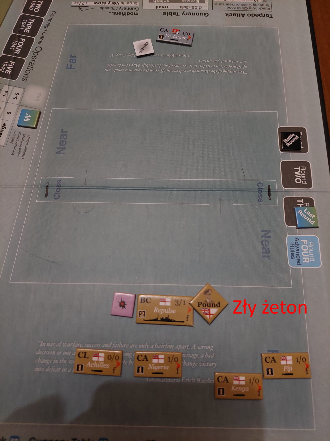 Jeden z pancerników został uszkodzony. Po zniszczeniu wieży 1 oraz pożarze na pokładzie, wycofano grupę z boju. Lotnictwo musi zająć się wrogim zespołem.