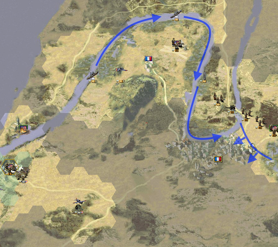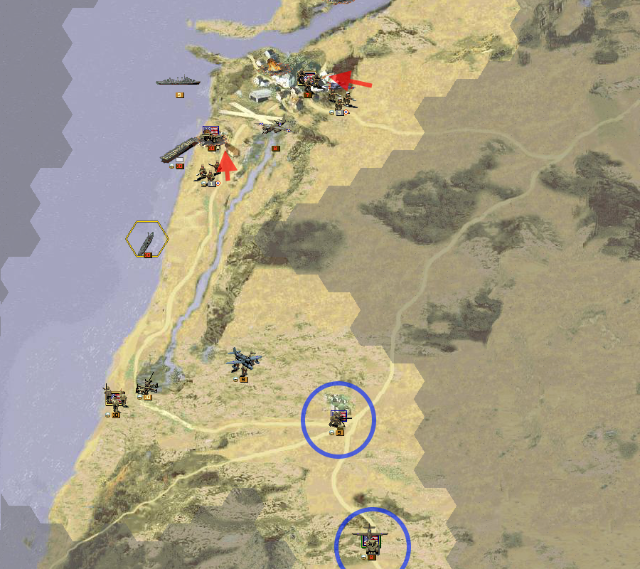 Na szczęście nic takiego nie ma miejsca. US Army nie napotykając oporu zajmuje okoliczne wzgórza i odcina miasto od posiłków z pustyni. Miasto jest silnie bronione przez piechotę wspieraną przez kilka korpusów jednostki artylerii 75mm. Nie ma co marnować sił amerykańskich chłopców: oba ciężkie okręty po dwóch salwach zmiękczają opór obrony do tego stopnia, że siły US Army nawet pod ogniem wrogiej artylerii napotykają zaledwie lekki opór.