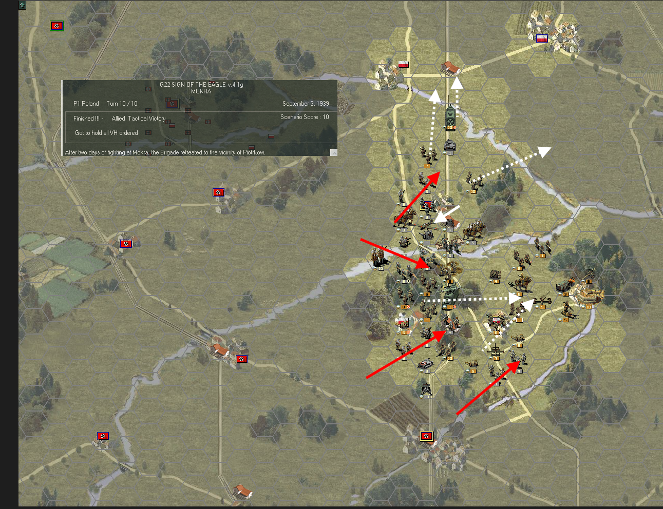 Deszcz, który nadszedł popołudniem był zbawieniem dla chwiejącej się obrony Polskiej. Niemieckie samoloty zniknęły z nieba, a i natarcie straciło na impecie (deszcz w grze uniemożliwia użycie lotnictwa i osłabia atakujące jednostki, dop. Finka). Nacisk Niemiecki od zachodu i Lis-Warty pomimo utraty impetu był tak silny, że zmusił WBK do wycofania swoich sił z lasów w okolicach Mokrej na nasyp kolejowy, gdzie formowano ostatnią linię obrony. Działka przeciwlotnicze strzelały ogniem na wprost do pojawiających się czołgów. Przy wsparciu Sztukasów obrona polska mogłaby ulec rozerwaniu. Szczęśliwie pogoda pozwala na odwrót. W tym samym czasie 30DP po przegrupowaniu ruszyła do kontrataku, celem odzyskania połączenia w WBK. Ich atak natrafia jednak na silne zagony pancerne i zamienia się w masakrę polskich żołnierzy, którzy przed wieczorem muszą wrócić na pozycje wyjściowe.