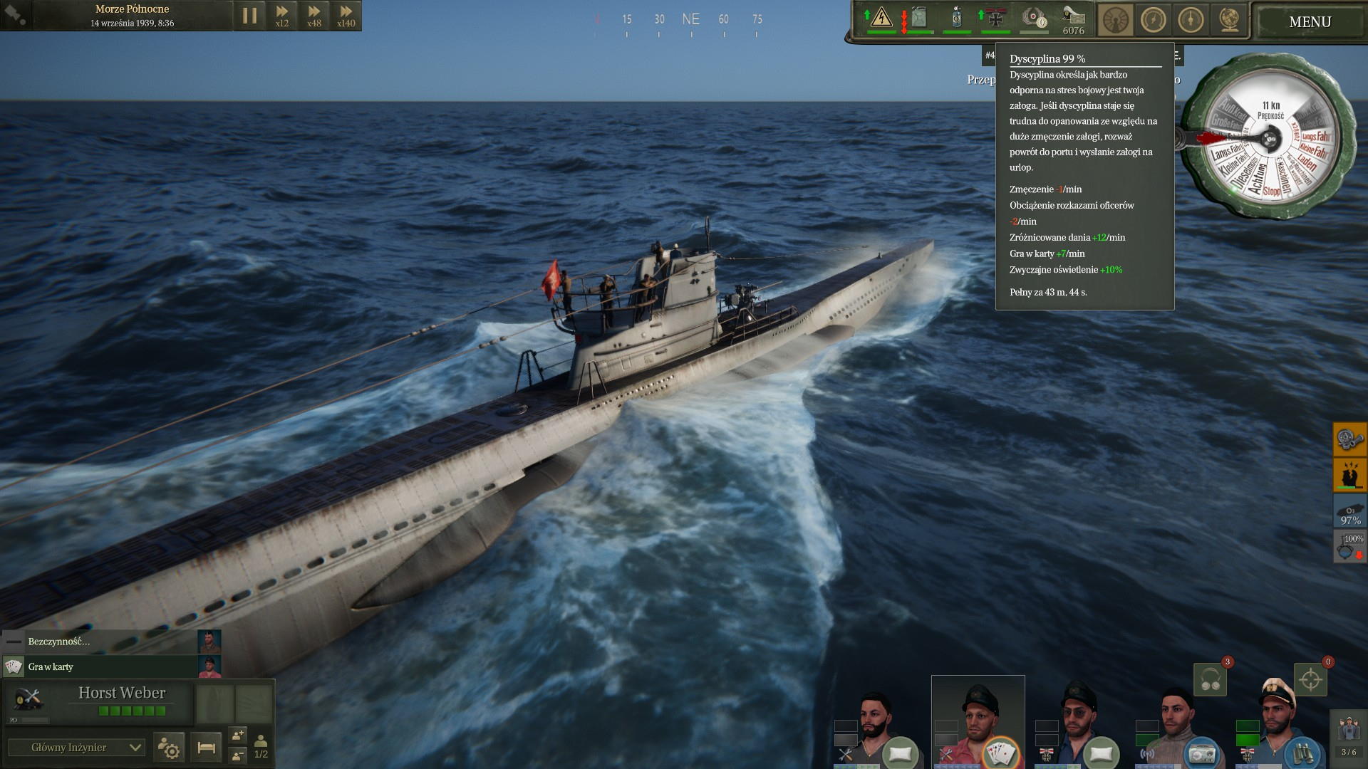 Że kara (w sensie spadek) punktów dyscypliny z czasem zostaje usunięty... Gdyż jak pływa się długo i długo... To załoga jest coraz mniej zdyscyplinowana i coraz więcej punktów dyscypliny się traci i już ani oficerowie grający z marynarzami w karty, ani kuk serwujący najlepsze dania, nie jest w stanie poradzić na to, że załoga jest bliska buntu i złamania w razie ataku