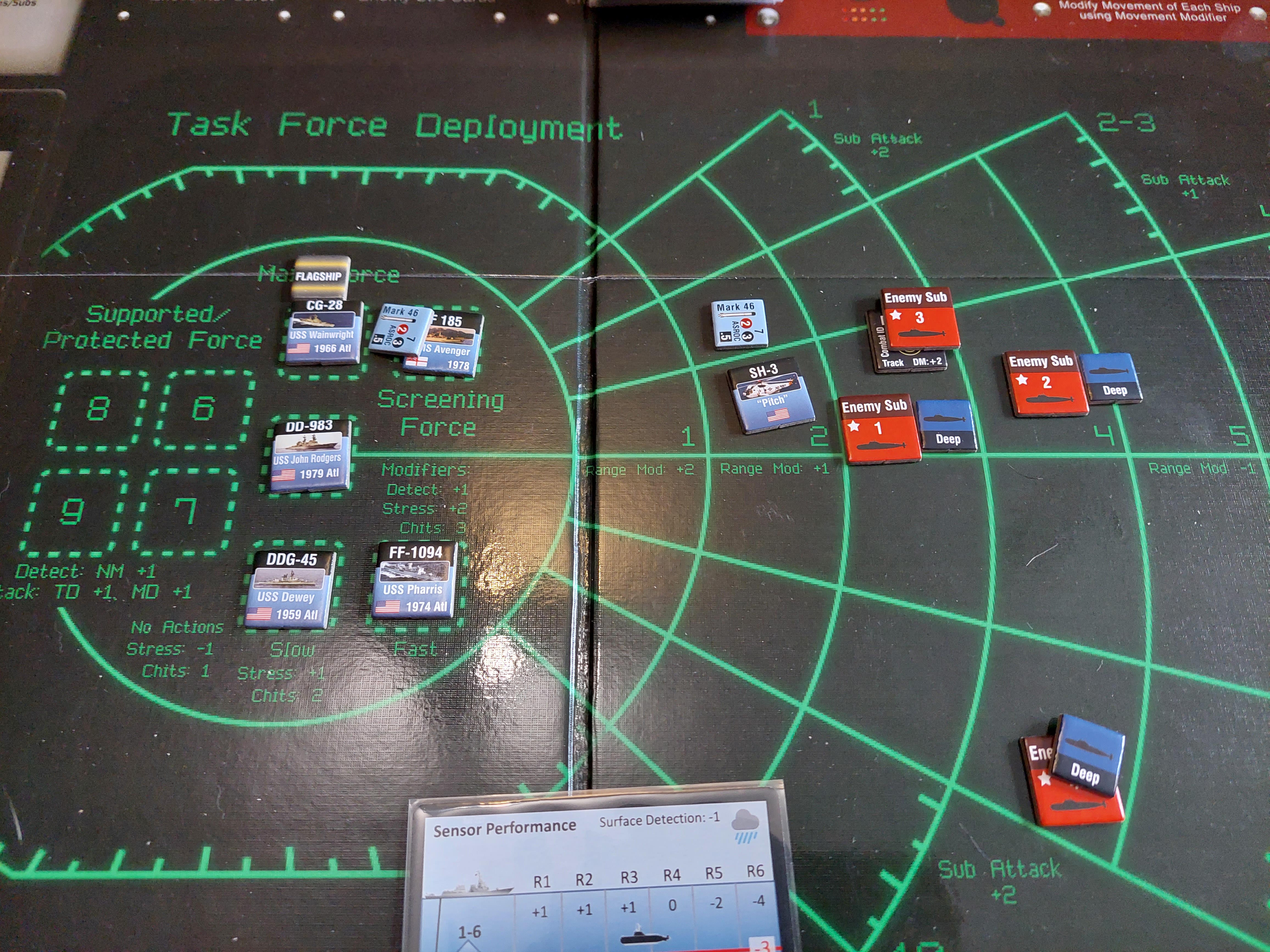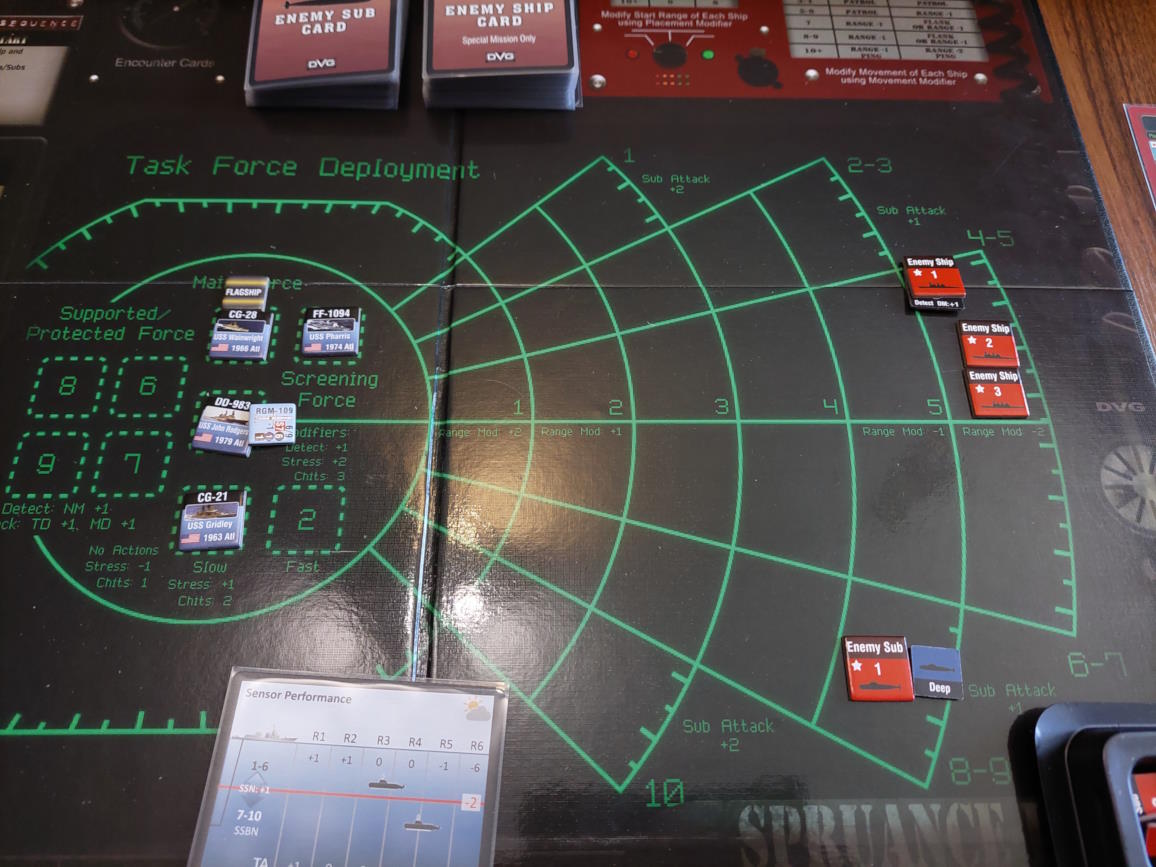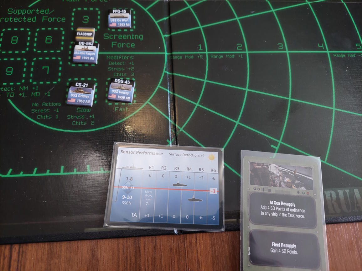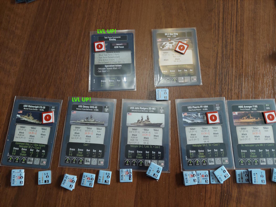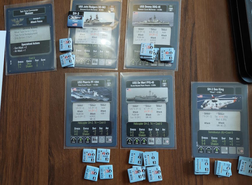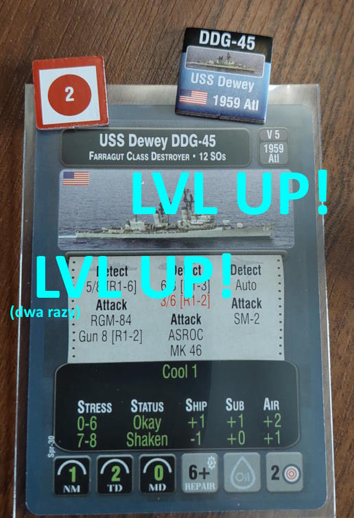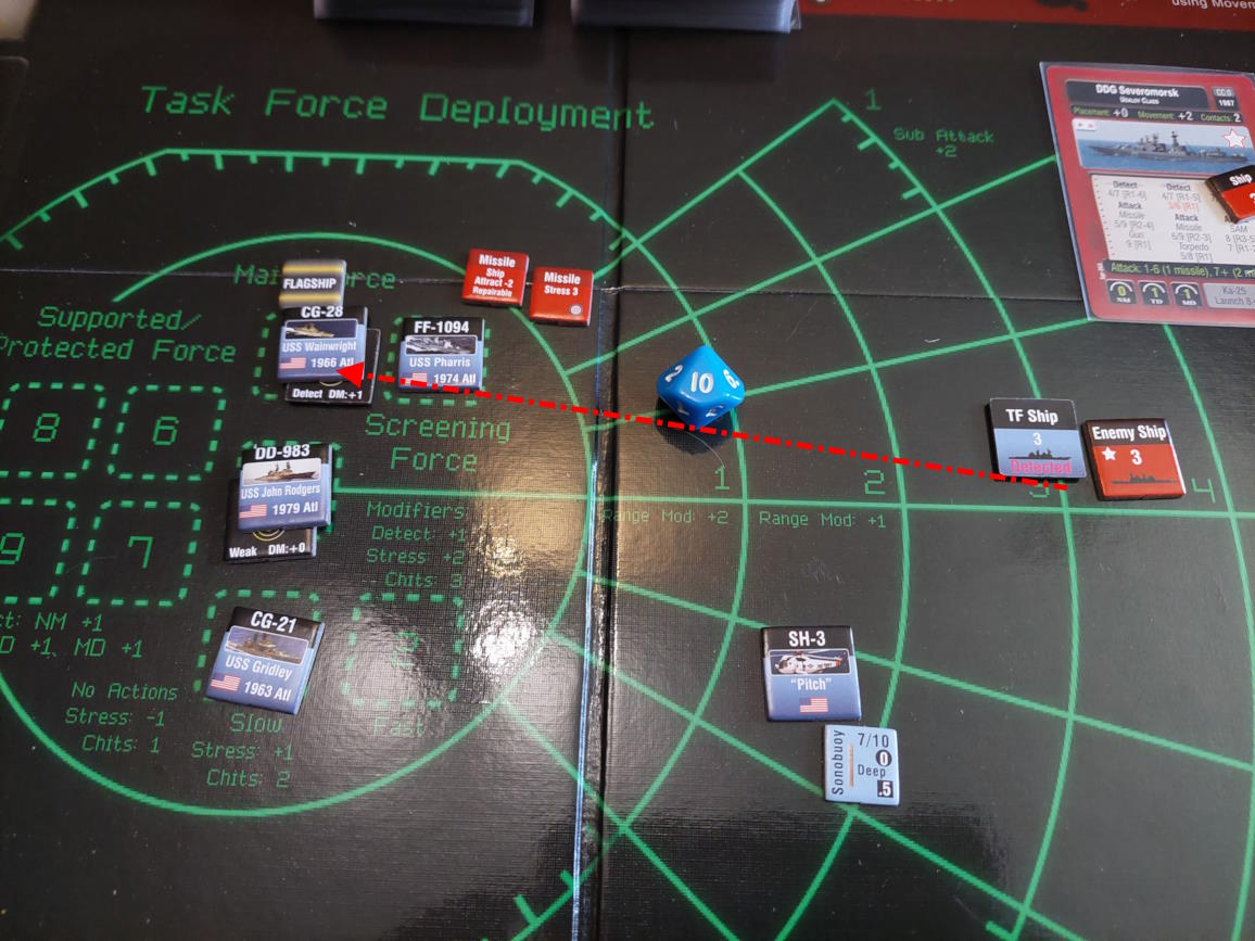 O 16:43 mój okręt flagowy stał się celem ataku. Ostatni Rosyjski okręt, rozpoznany potem jako Severomorsk przeprowadził atak na USS Wainwright, CG-28, uzyskując dwa trafienia. Uszkodzony został system kierowania ogniem, a druga z rakiet SS-N-14 Silex (prawdopodobnie) trafiła okręt w pobliżu wyrzutni rakietorped. To już nie były stateczki, teraz naszym przeciwnikiem byli prawdziwi sowieccy marynarze... Literówka na żetonie. Mój okręt otrzymał -2 do pociągania
