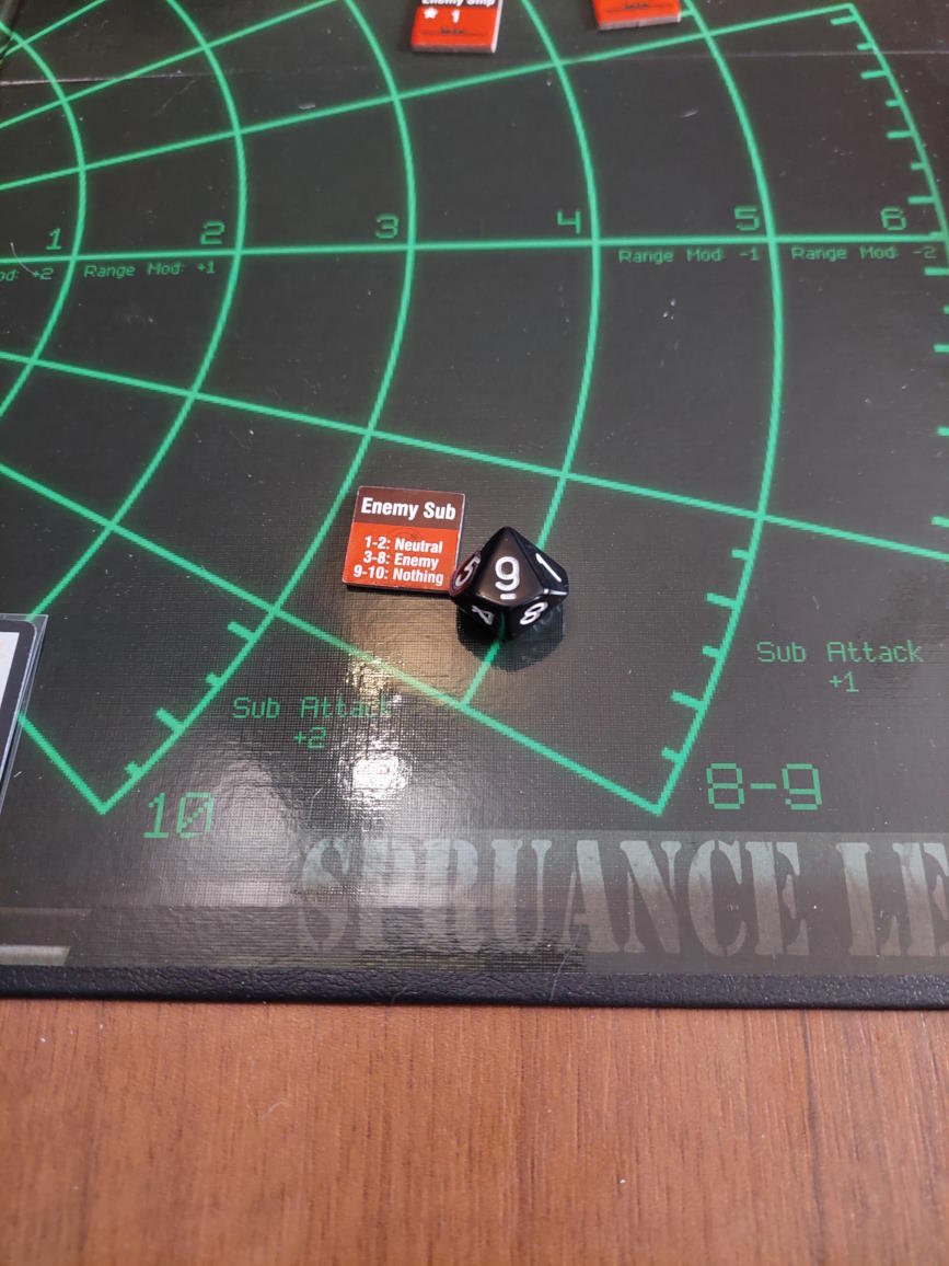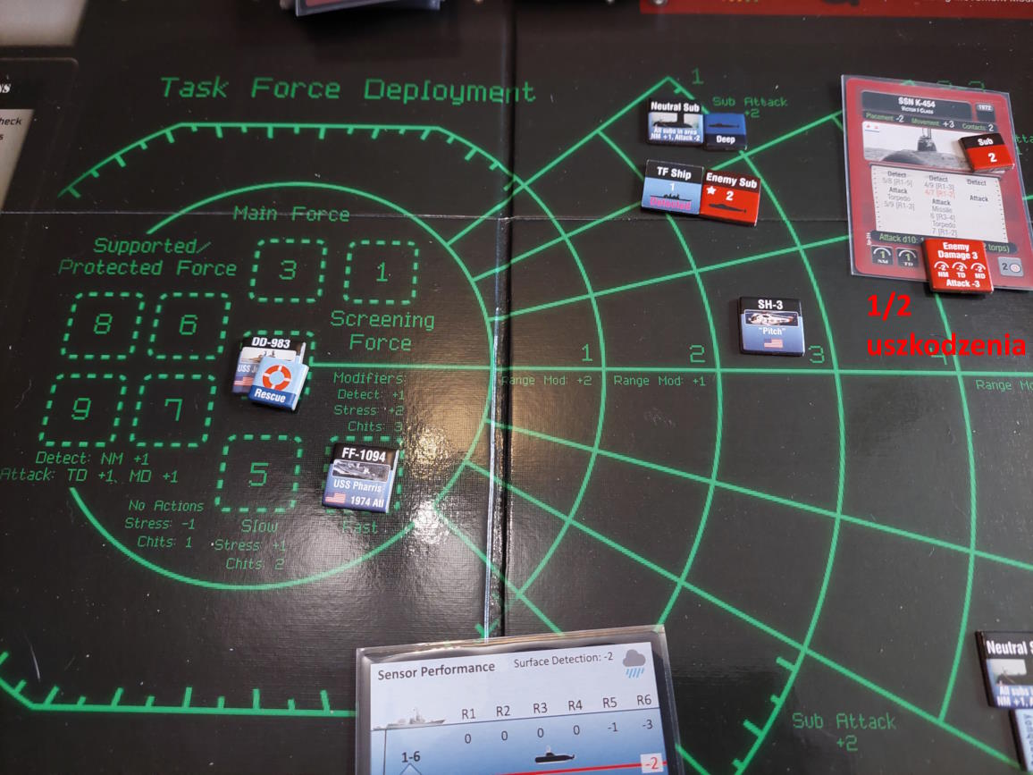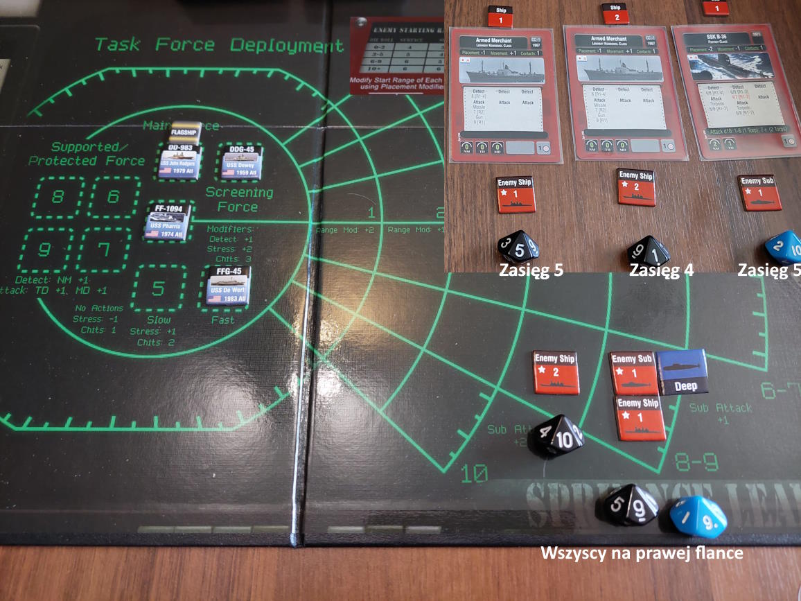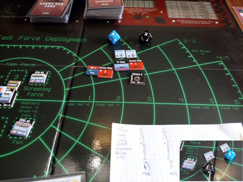 ... gdy nawiązano kontakt z wrogim zespołem. Akcje szybkie dowódcy: 1 - zbliżenie, rzut na chorobę udany, akcje okrętów szybkie (osłona) - rozpoznanie celu -> Uzyskano kontakt z nierozpoznaną jednostką [pogoda uniemożliwia osiągnięcie pełnej identyfikacji kontaktu. Przy 1k10 kara za pogodę wynosi 3, a rozpoznanie wymagałoby wyniku 9, przy najlepszej załodze mogącej dodać +1 do rzutu