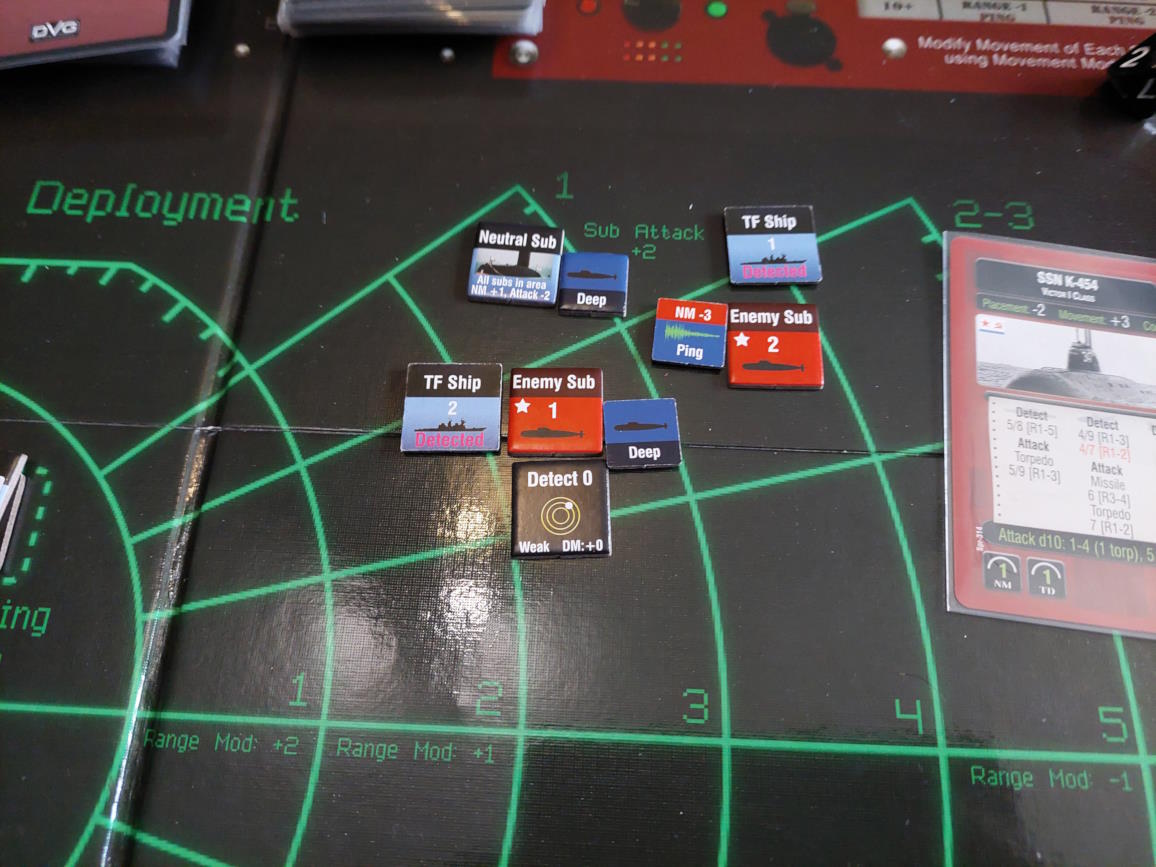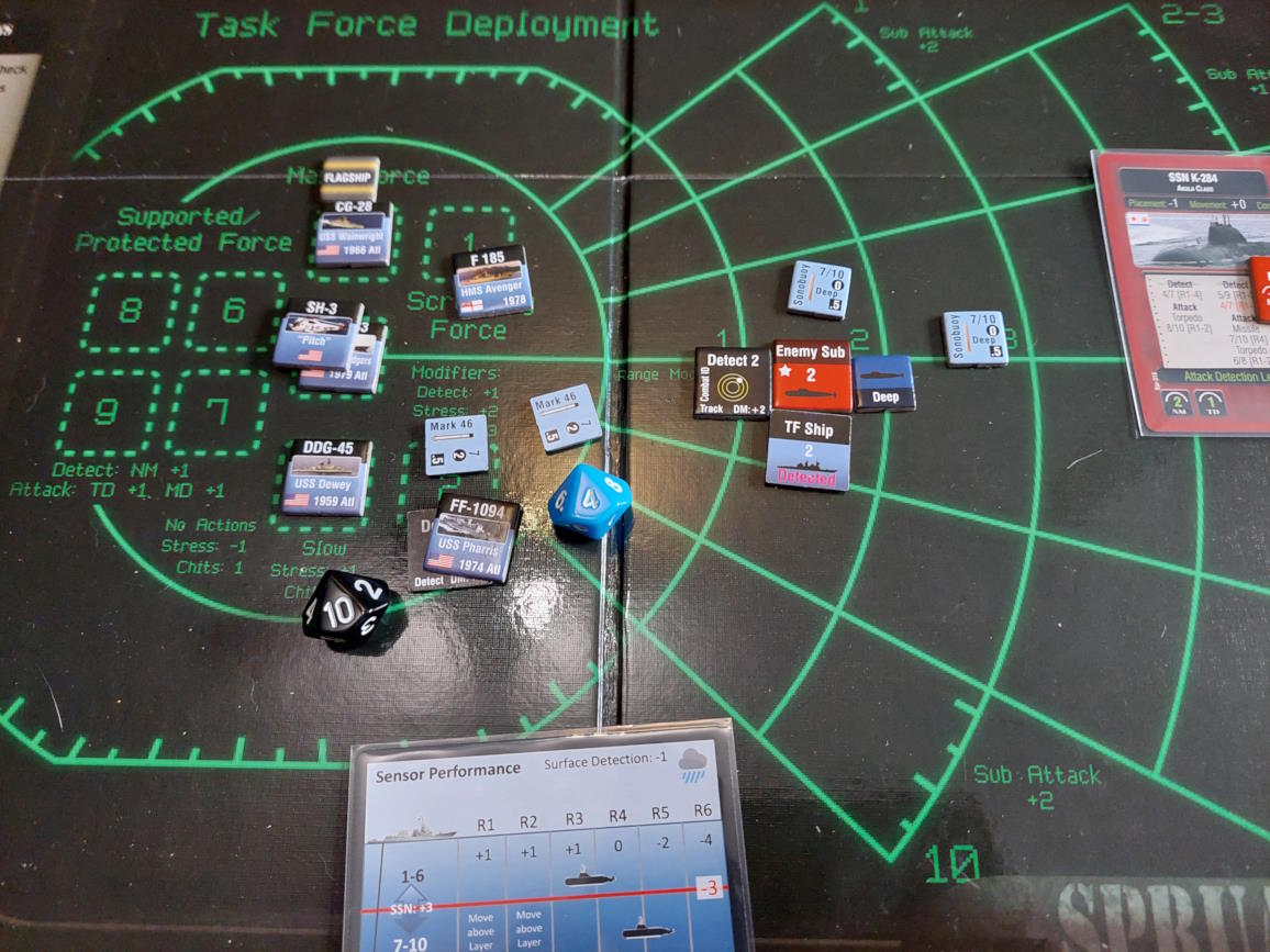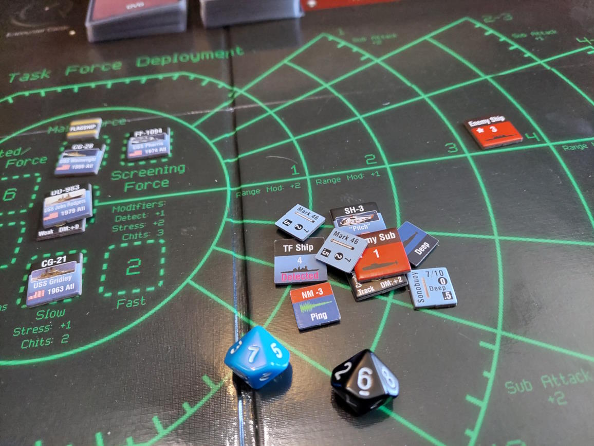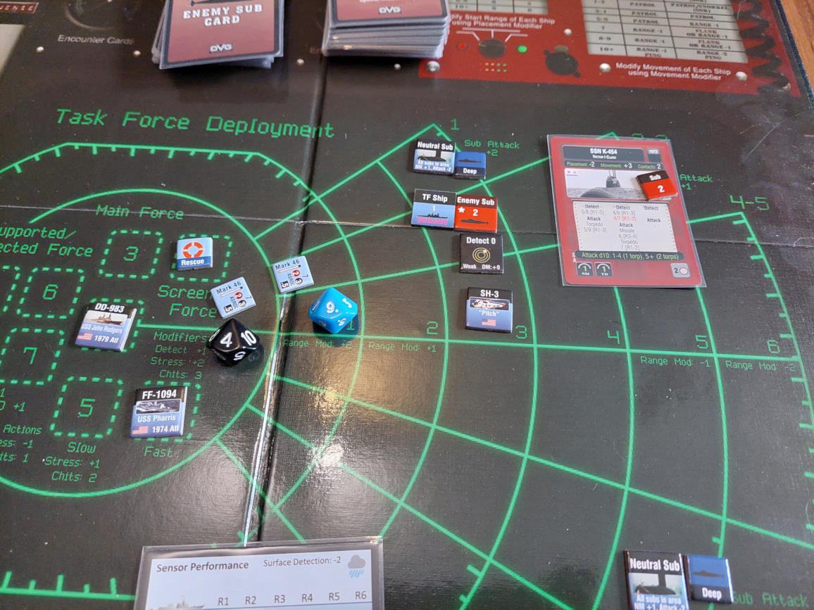 ... gdy nawiązano kontakt z wrogim zespołem. Akcje szybkie dowódcy: 1 - zbliżenie, rzut na chorobę udany, akcje okrętów szybkie (osłona) - rozpoznanie celu -> Uzyskano kontakt z nierozpoznaną jednostką [pogoda uniemożliwia osiągnięcie pełnej identyfikacji kontaktu. Przy 1k10 kara za pogodę wynosi 3, a rozpoznanie wymagałoby wyniku 9, przy najlepszej załodze mogącej dodać +1 do rzutu