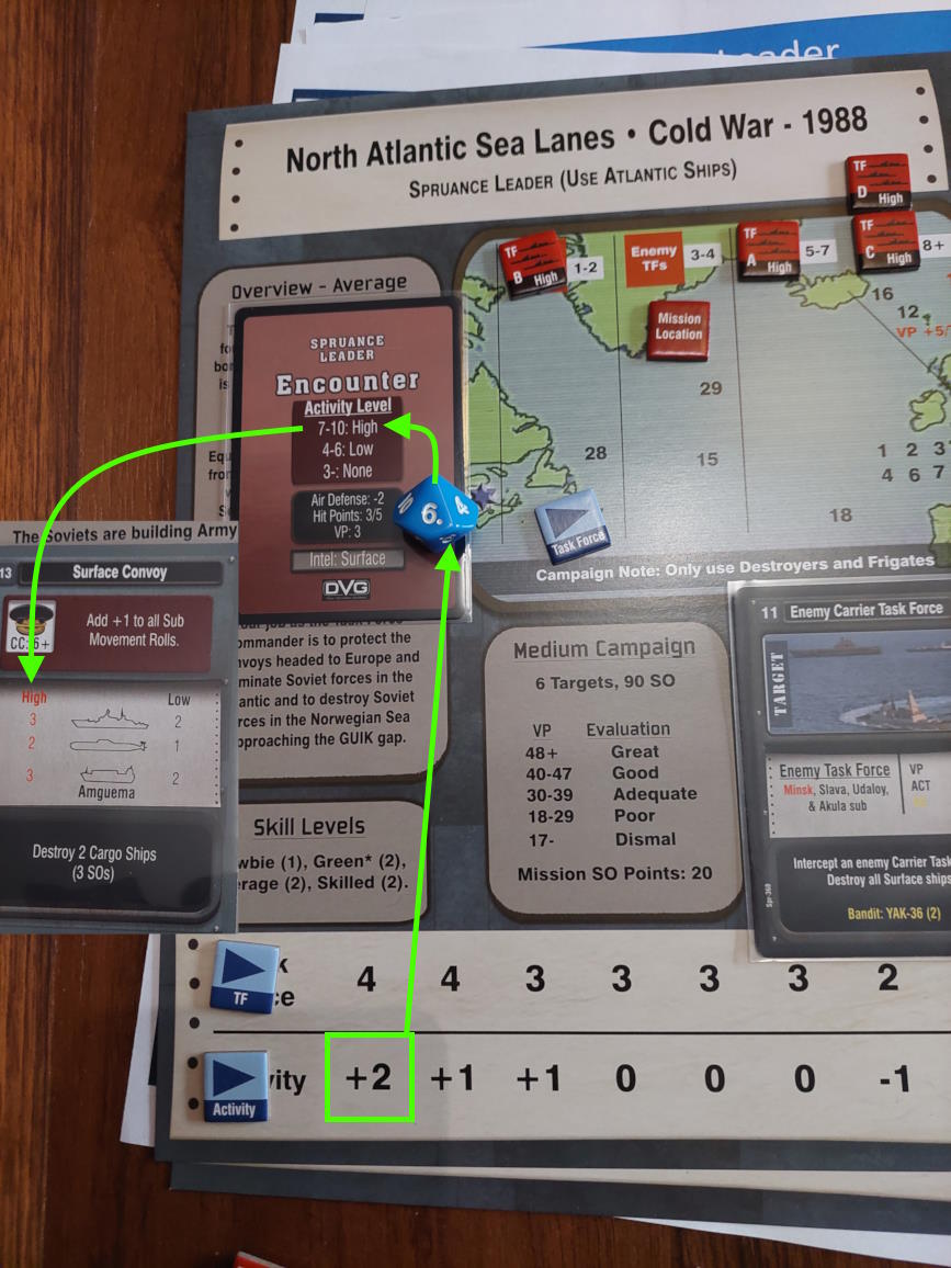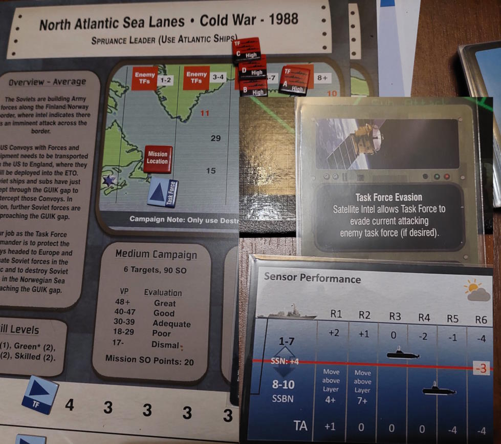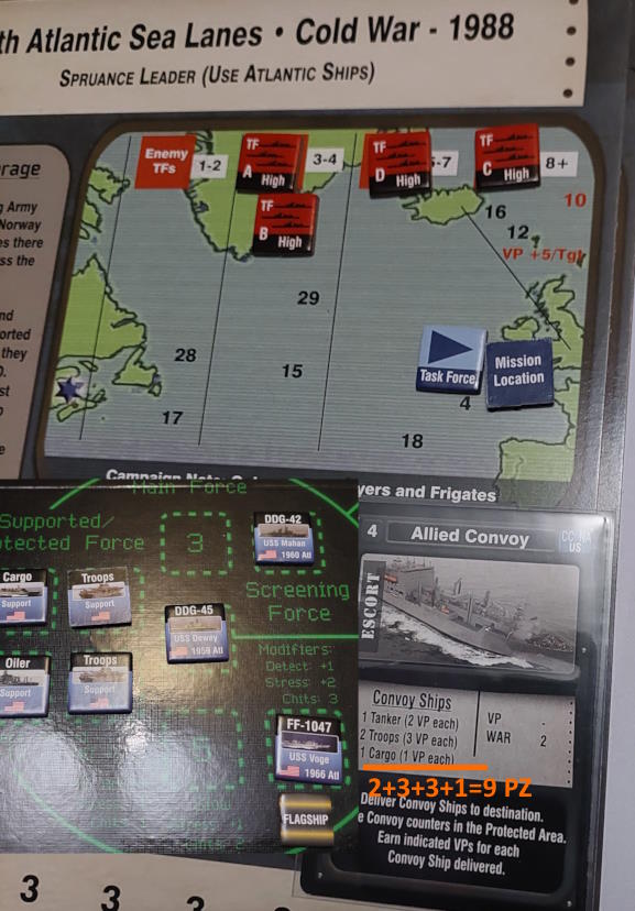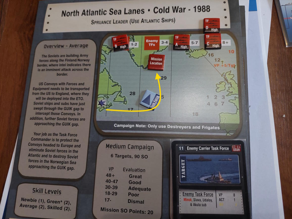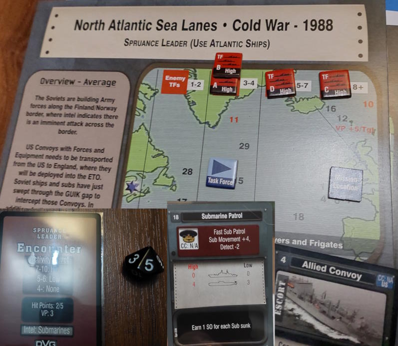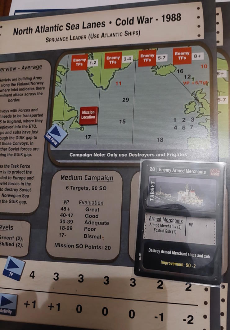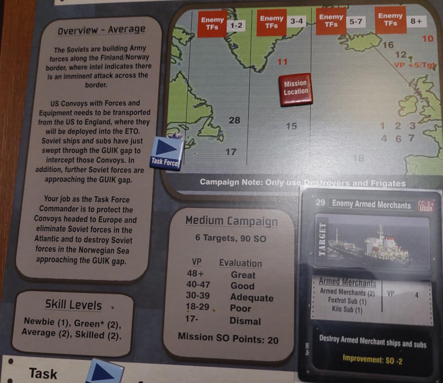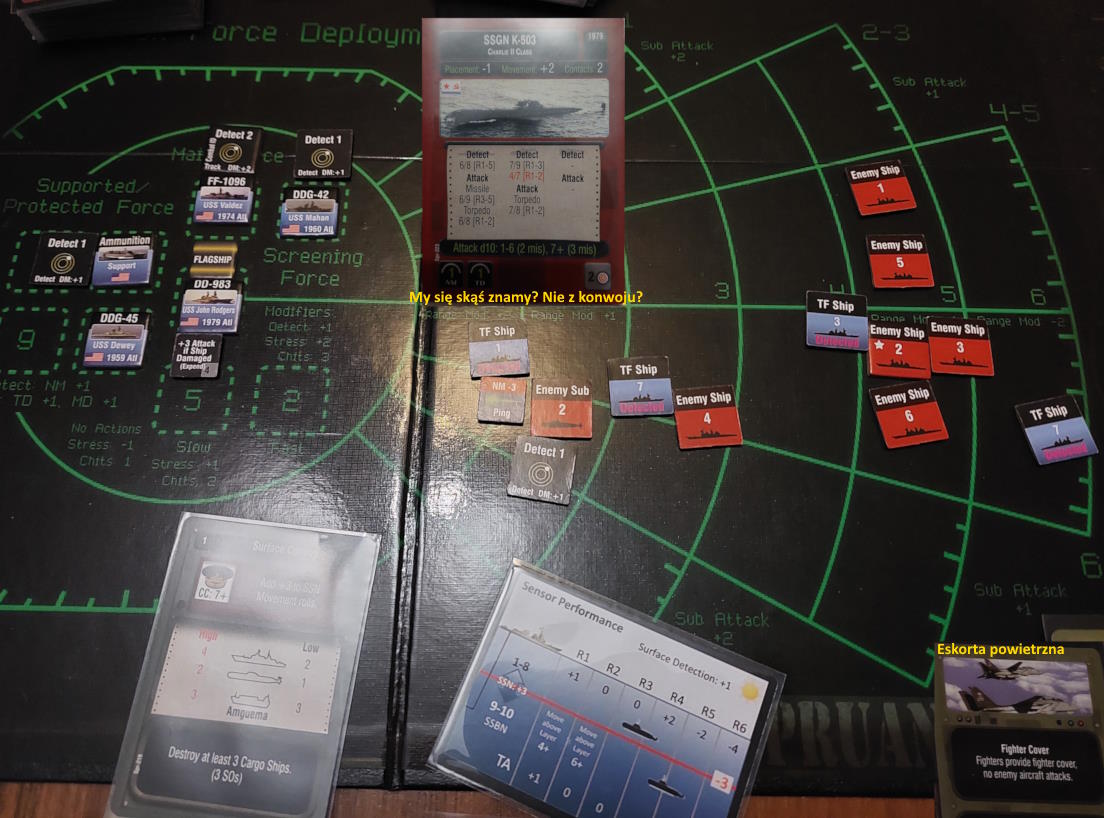Mijaliśmy właśnie Ławicę Nowofunlandzką, gdy odebrałem nowe rozkazy. Mińsk, lotniskowiec wroga, nie kieruje się na południe, a czeka na konwój, który zmierza z południa. Sowieci najwyraźniej pozyskali jakieś cenne zasoby z południa i starają się je przetransportować na drugą stronę Atlantyku. Z zespołu Mińska odłączył się krążownik rakietowy typu Slava i niszczyciel i mają spotkać się z zespołem. Dowództwo nie dba o konwój. Mogą go zatopić okręty podwodne i lotnictwo. Naszym głównym zadaniem jest pozbycie się okrętów sowieckich, aby można było rozgromić bezbronny konwój... Oczywiście zatopienie konwoju jest też mile widziane...