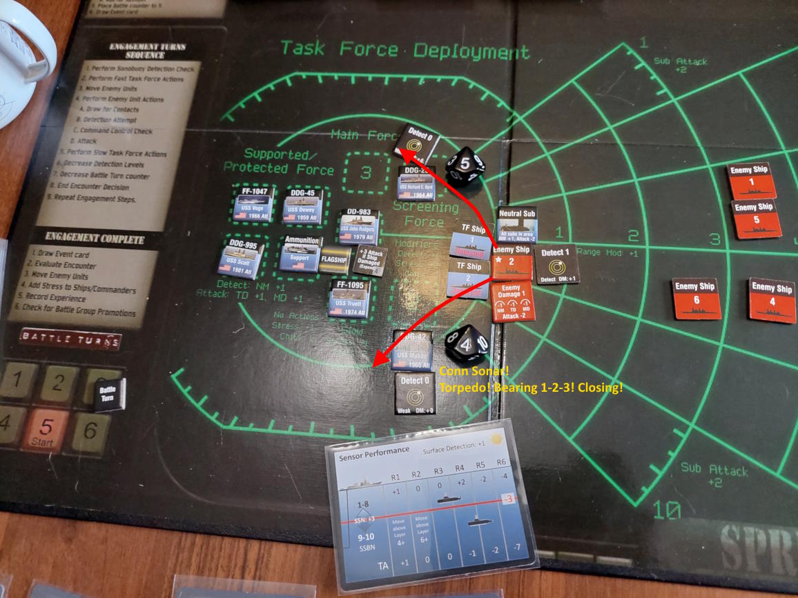 Gdy zbliżyliśmy się do spodziewanej pozycji konwoju, sonar na USS Valdez wykrył zbliżający się kontakt podwodny. Nie mając informacje o sojusznikach, odpowiedź mogła być tylko jedna: Wróg