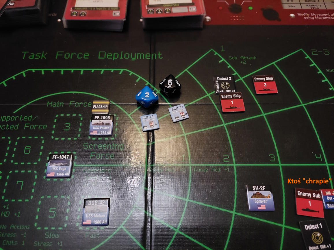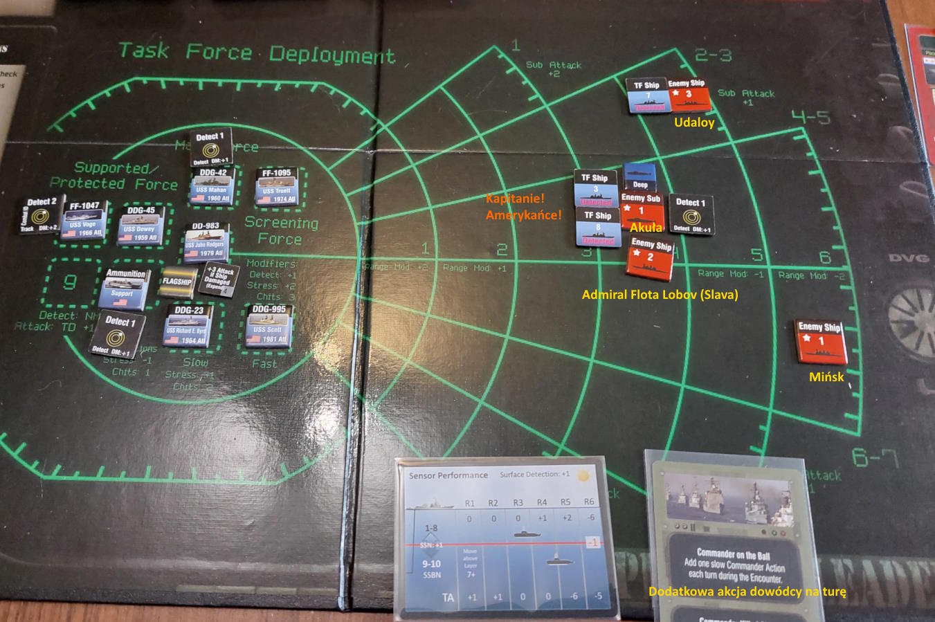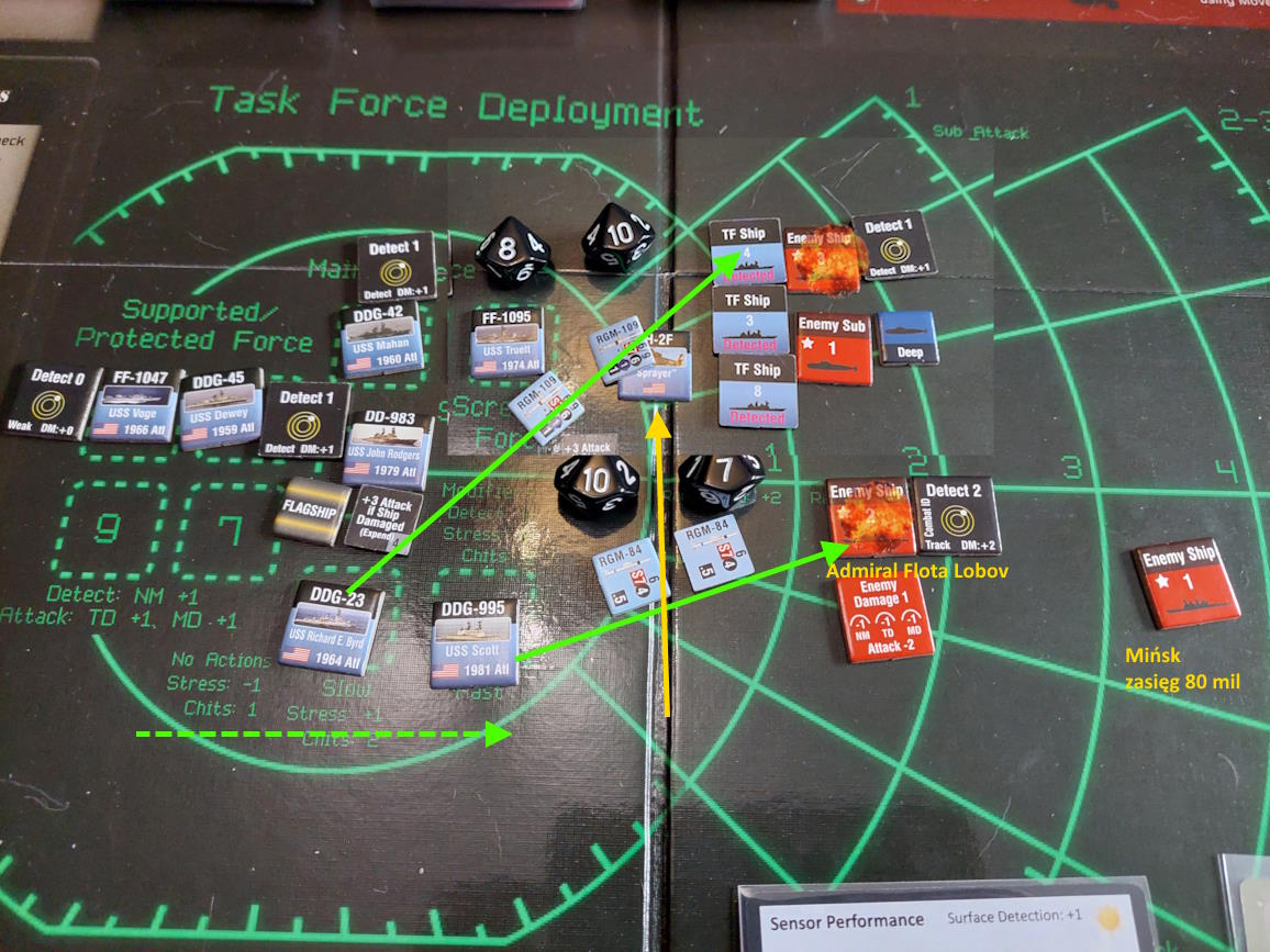Mając coraz lepszy namiar na Admirała Lobova udało się nam go wreszcie posłać na dno Harpoonami, a uzyskawszy kontakt z okrętem z kierunku ataku błędnie uznałem, że to musi być Mińsk i posłaliśmy w jego stronę połowę Tomahawków, jak się potem okazało w ten sposób wyeliminowaliśmy niszczyciel.