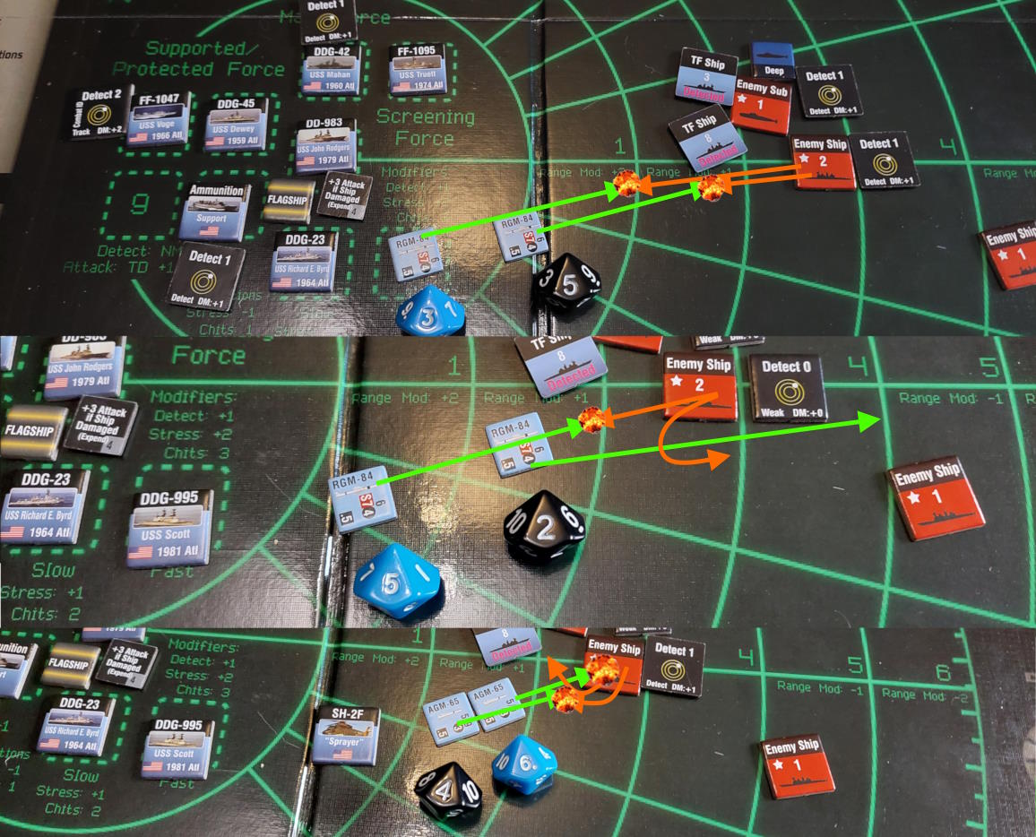 Połowa sowieckich samolotów wystrzeliła rakiety przeciwokrętowe AS-9 "Kyle" w nasze prowadzące niszczyciele. USS Scott odparł atak, ale USS Truett został śmiertelnie ugodzony...
