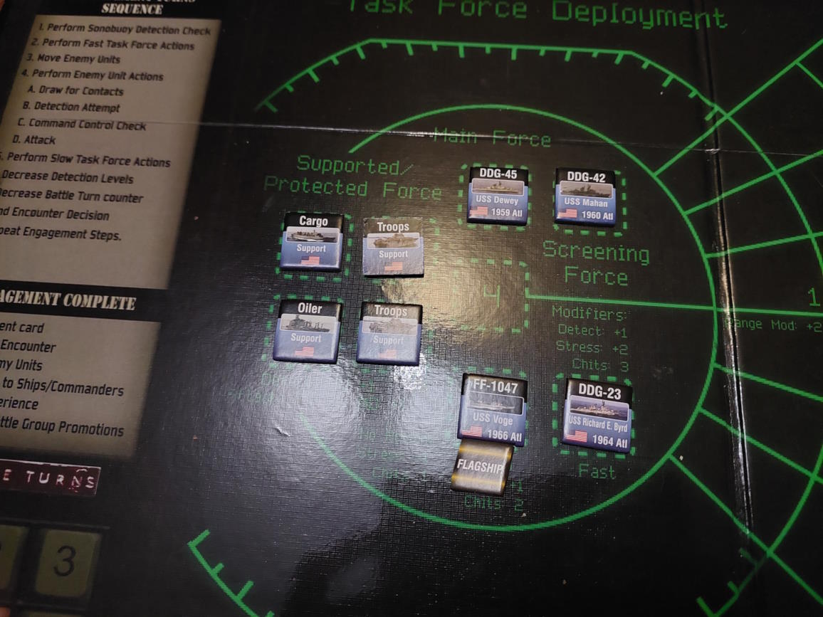 Miałem nadzieję, że to my pierwsi wykryjemy konwój, jednak pierwszym kontaktem był okręt podwodny klasy Kilo. Załoga z USS Truett wykryła ten okręt, gdy próbował zbliżyć się do naszego zespołu. Mam nadzieję, że nie zdążył nadać meldunku i czekał, aż przejdziemy. Niemniej ostrzeżenie o naszej obecności, to ostatnie czego chcemy. Rozkazałem wystrzelić w jego kierunku rakietorpedy i wkrótce uzyskaliśmy potwierdzenie trafienia okrętu podwodnego. USS John Rodgers (DD-983) przestał być dziewicą...