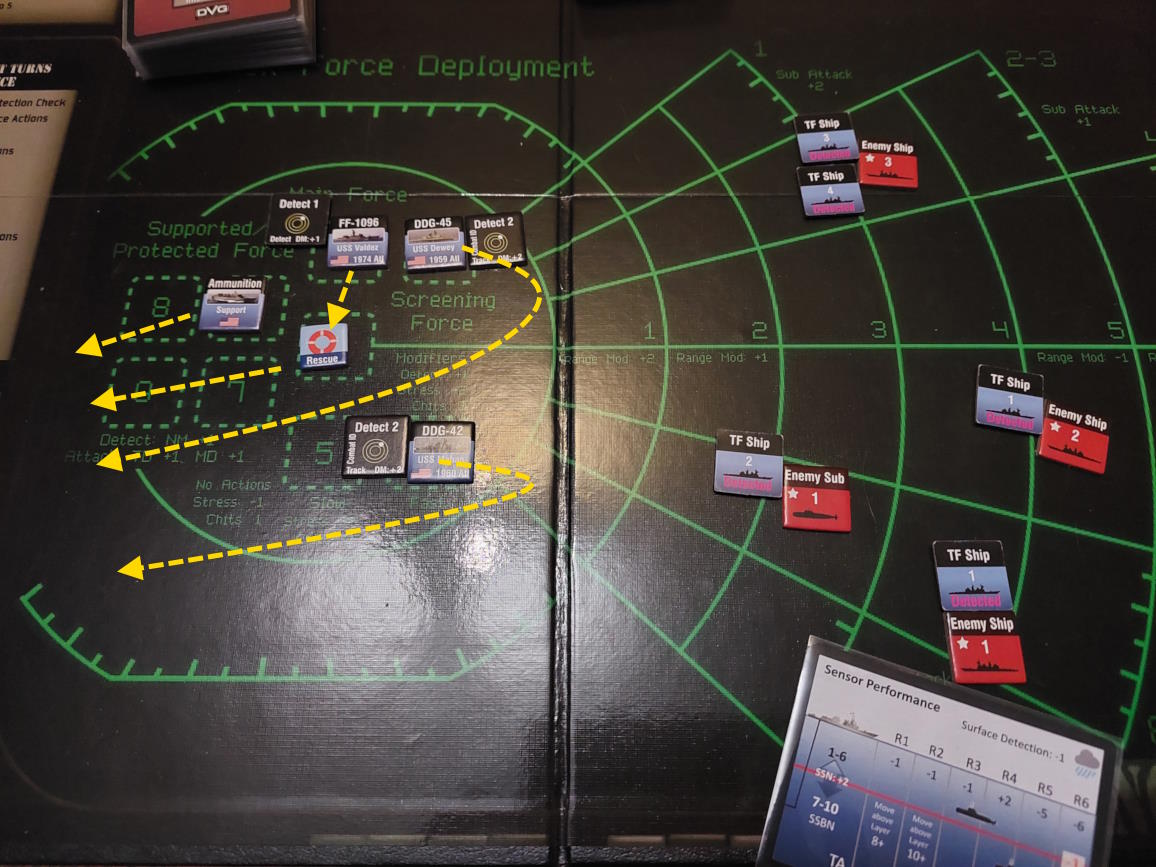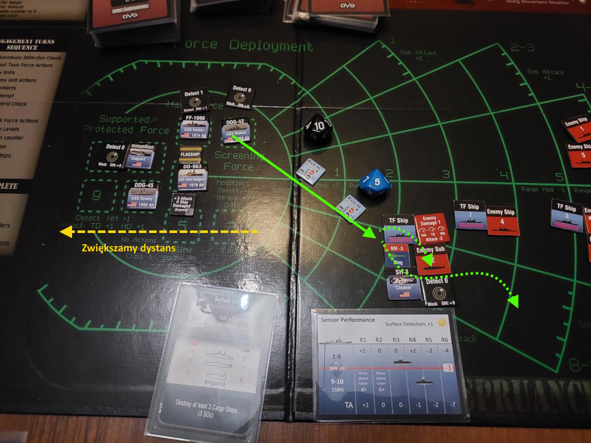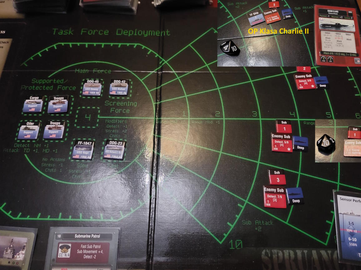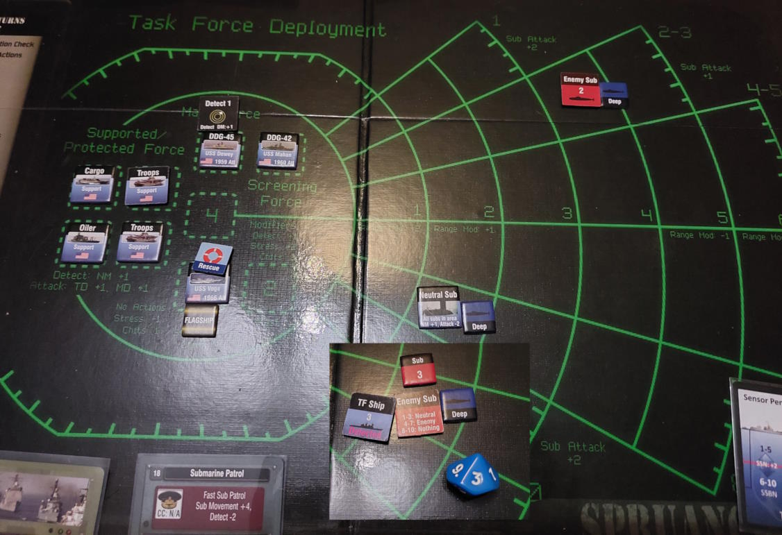 Niestety, okręt podwodny był pomiędzy nami. Chcąc nie chcąc musieliśmy najpierw uporać się z okrętem podwodnym, albo ryzykować rajd przez okręt podwodny. Nie chcąc ryzykować utraty okrętów zaczęliśmy od eliminacji okrętu podwodnego. Wreszcie sonary zarejestrowały eksplozje i odgłosy tonącej jednostki.