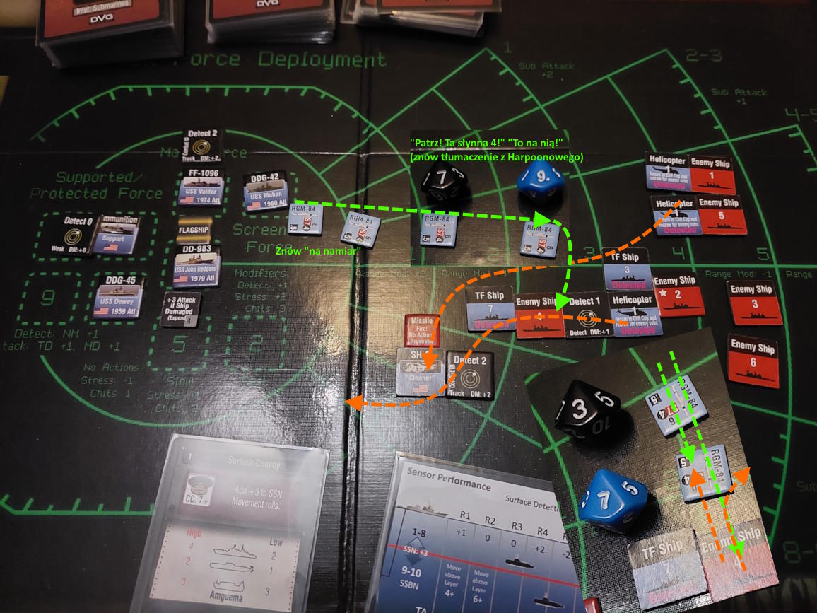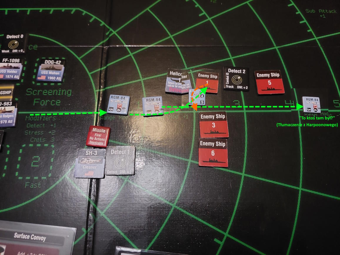 Kontakty z grupą nawodną urywały się, więc rozkazałem odpalić Harpoony w trybie poszukiwania wroga. Rakiety zadziałały poprawnie, a przeciwnik odpalając w obronie rakiety zdradził swoją pozycję. Niestety, wróg obronił się skutecznie...