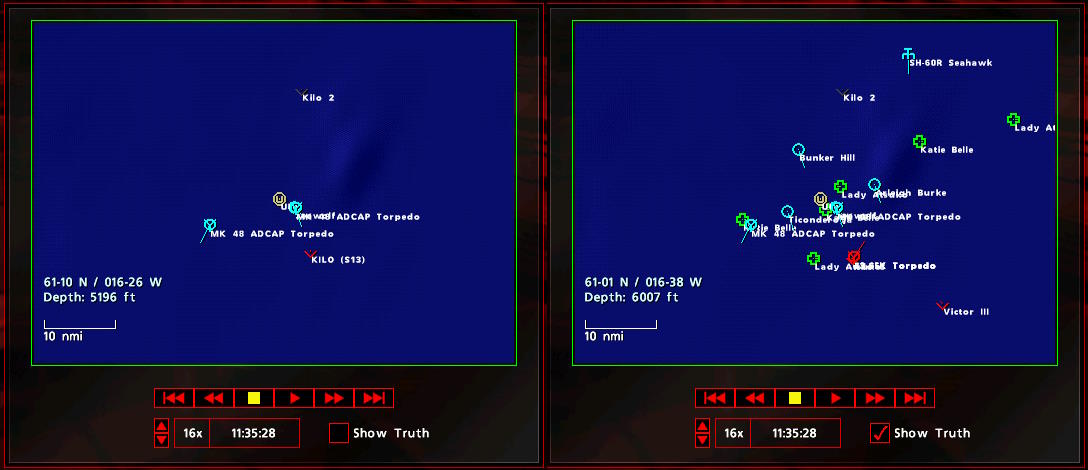 Była 10:17, gdy operator sonaru zaklasyfikował jeden z kontaktów jako potencjalny okręt podwodny klasy Kilo. Finek rozkazał wystrzelić torpedę ustawiając jednak jej górny pułap poniżej 80 stóp... Okręt podwodny na głębokości peryskopowej i statki handlowe powinny być bezpieczne... A okrętów podwodnych spodziewał się niżej... Obrazek z lewej pokazuje jak ja widziałem kontakty, ten z prawej z "show truth" to obraz prawdziwy