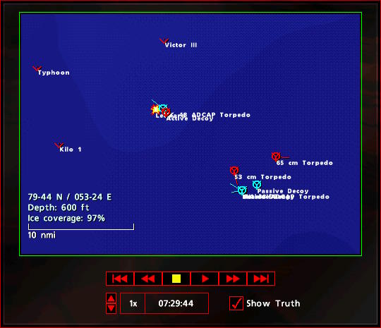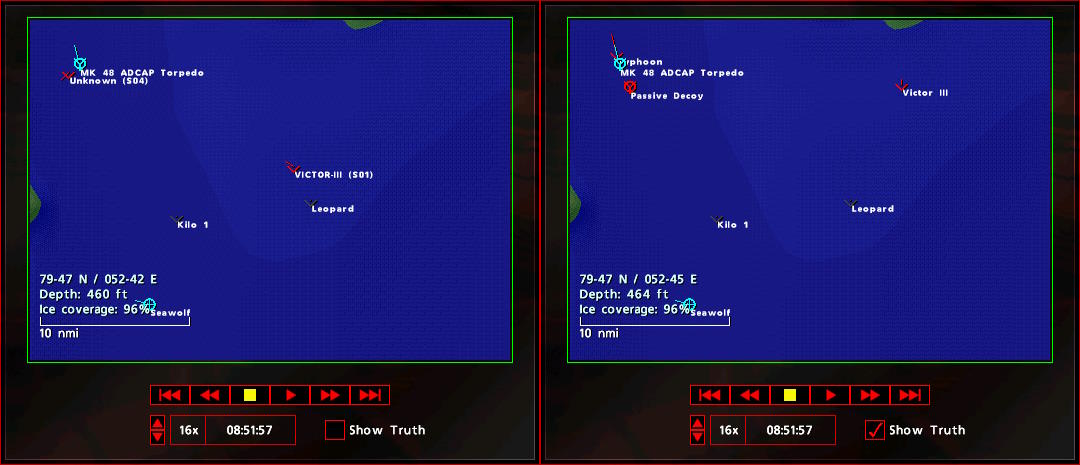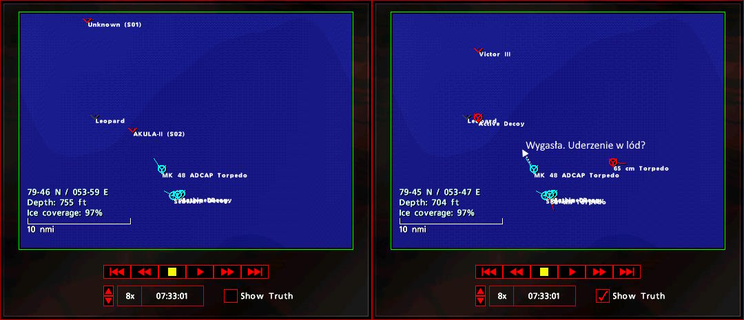 Akuła nie pozostała dłużna odpalając również dwie torpedy w kierunku okrętu wroga. I tak oba okręty oddalały się od siebie, ścigane przez torpedy. Akuła na płytkie wody z lodowymi osłonami, Seawolf ku głębszym Podczas walki nie aktualizowałem TMA