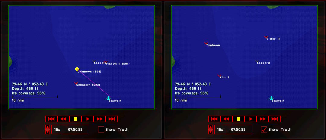 Tuż po 7:00 operator sonaru wykrył dwa kontakty w pobliżu miejsca, gdzie spodziewano się wrogiego okrętu podwodnego. Po lewej to, co ja w TMA określiłem, po prawej stan faktyczny