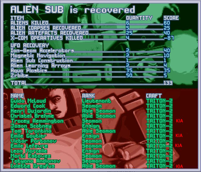 Raport który składał admirał X-COM był tym, czego komisja oczekiwała od początku wojny. Zwycięstwo. Wielki Śniący jest pokonany. Jednak w raporcie znalazła się informacja o ilości poległych w wojnie... w tym cały oddział Lewiatan...