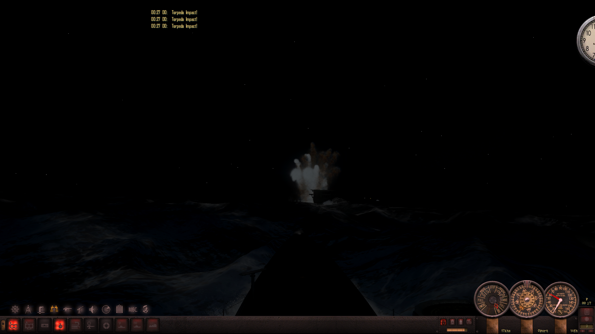 Uderzamy w bok konwoju, atakując i]Nagara Maru[/i] i Hakusaka Maru. Hakusaka otrzymuje dwa trafienia, jednak nie tonie. Drugi cel zaczyna manewrować i to prawdopodobnie powoduje że wymija torpedy.