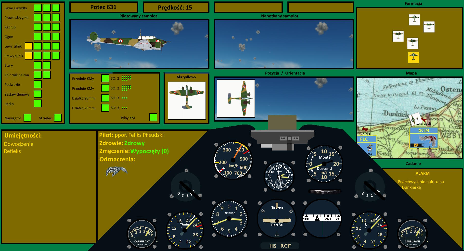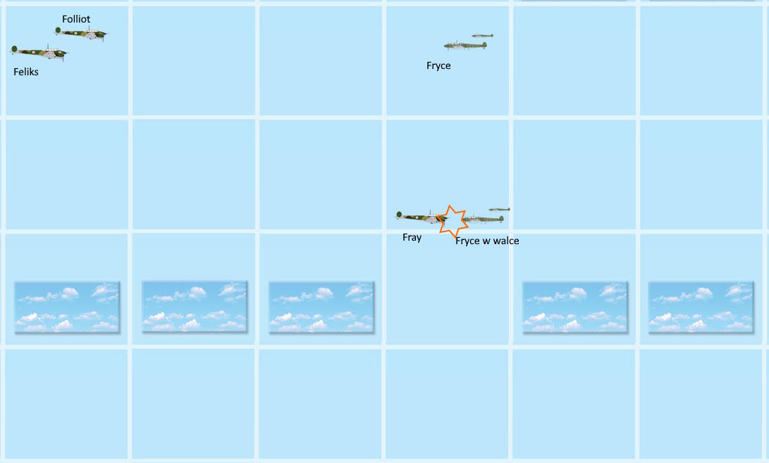 Zapewne nie powtarzał meldunku z radia, a mogąc patrzeć do góry, relacjonował, co się dzieje nad nim... I nagle kropki się łączyły. Szóstka u góry przeciw czterem. To znaczy, ze dwóch może być wolnych... i to oni będą teraz mogli spaść na Feliksa, o ile Potezy u góry ich nie zatrzymają... Choć osobiście Feliks by na ich miejscu wykorzystał przewagę na wyższym pułapie.