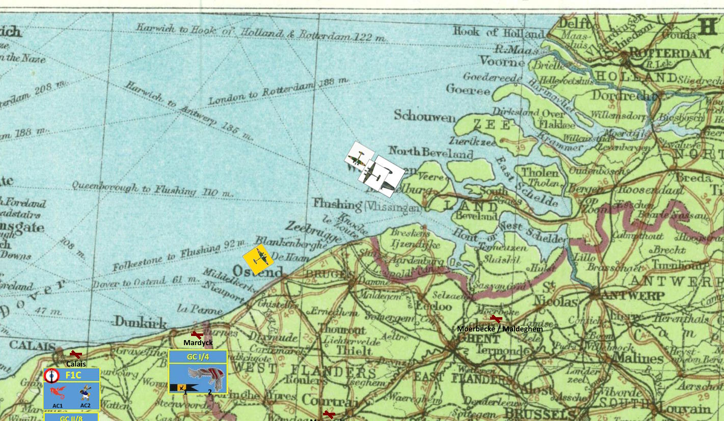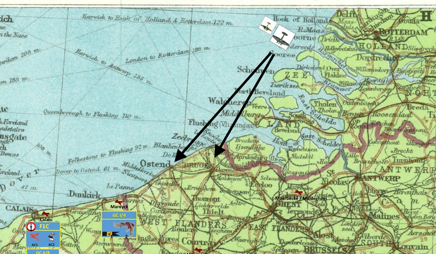 Do śledzonej grupy było jeszcze jakieś 50 kilometrów. Z tą prędkością zaraz powinni mieć bezproblemową łączność z drugą eskadrą pozwalającą na swobodną rozmowę oraz dostrzec bombowce, które najwyraźniej kierowały się na Brugię. I wtedy w radio usłyszał głos porucznika Folliota: