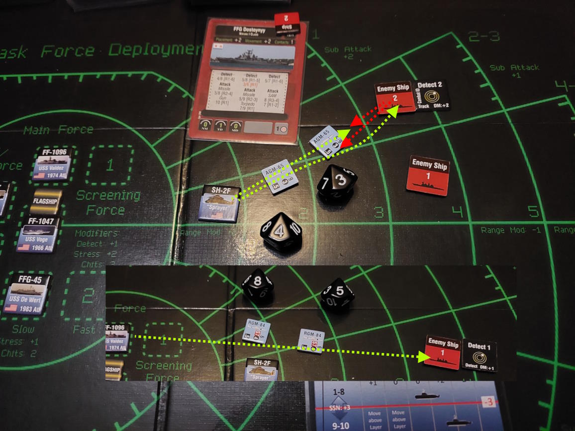 Podążając do wyznaczonego miejsca, udało nam się złapać kontakt radarowy. Niszczyciel najwyraźniej również szukał, gdzie my jesteśmy. To znalazł naszą salwę z Harpoonów.