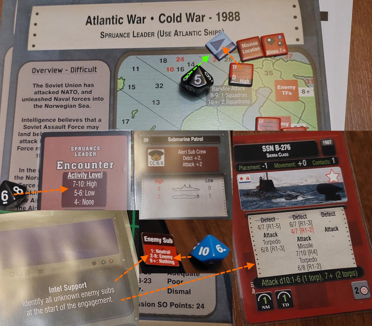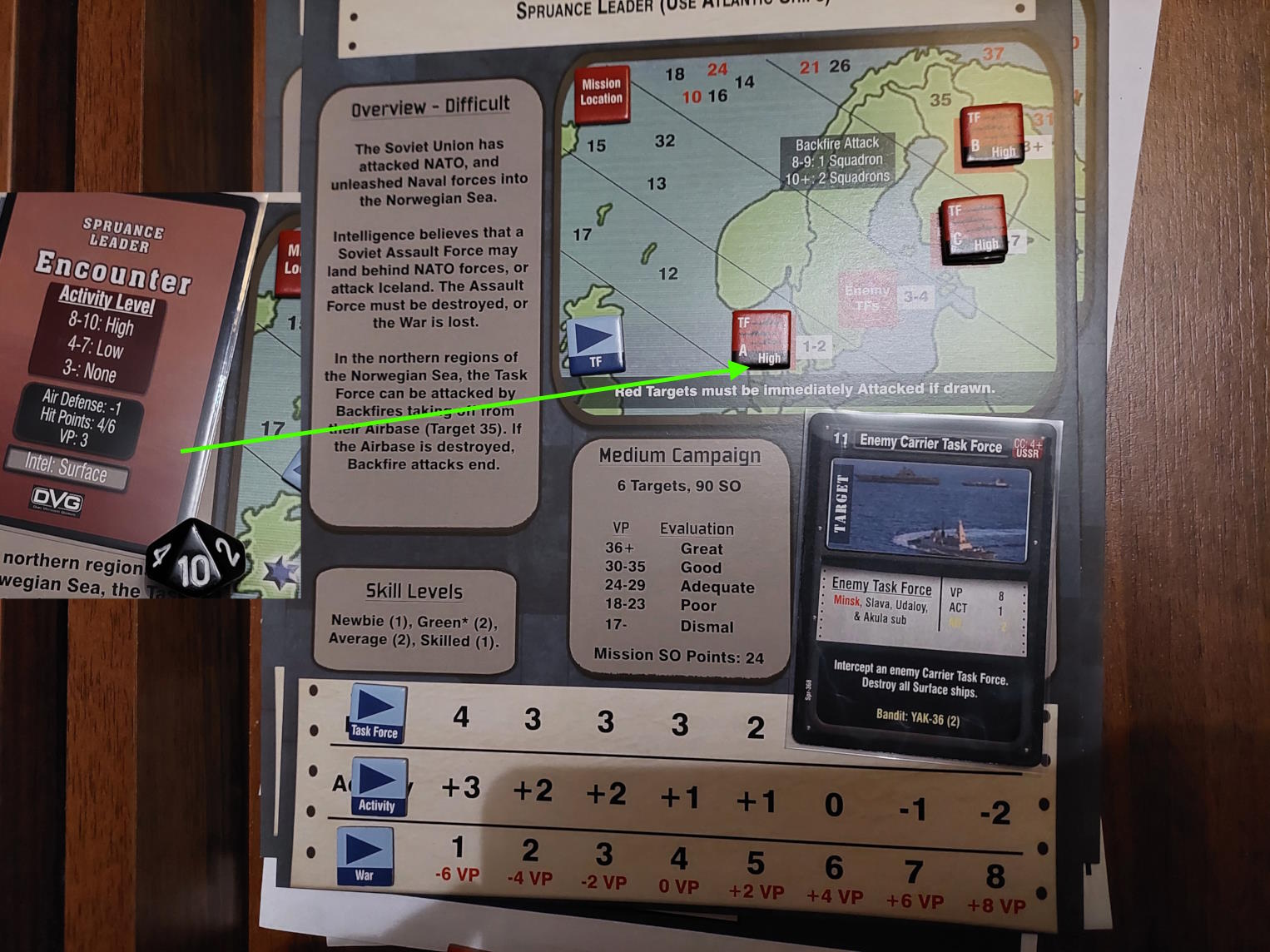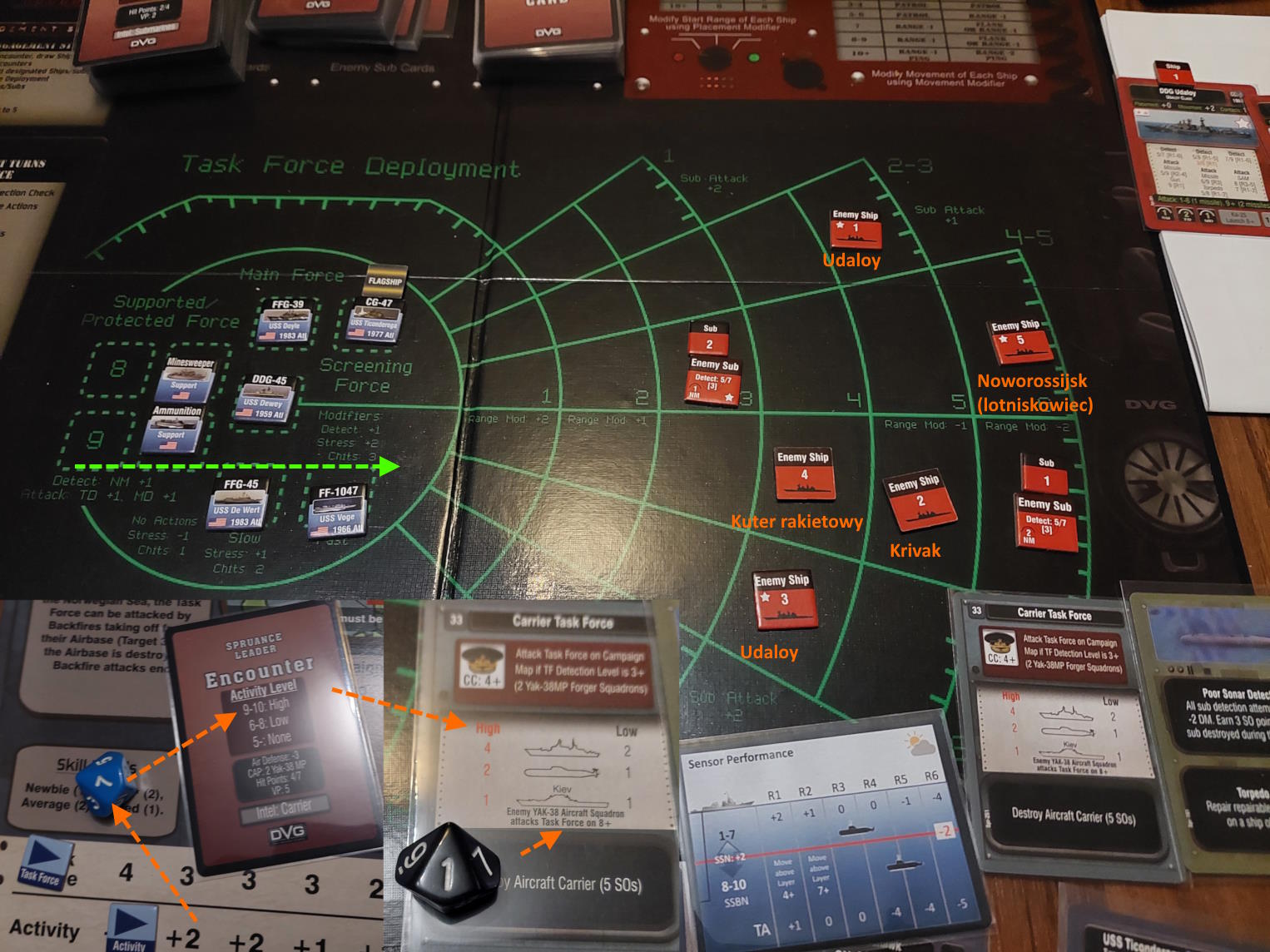 Po alfie nie zrobiłem zdjęcia karty, że wywiad daje -3 do testu aktywności wroga i rzut na spotkanie był +2-3=-1