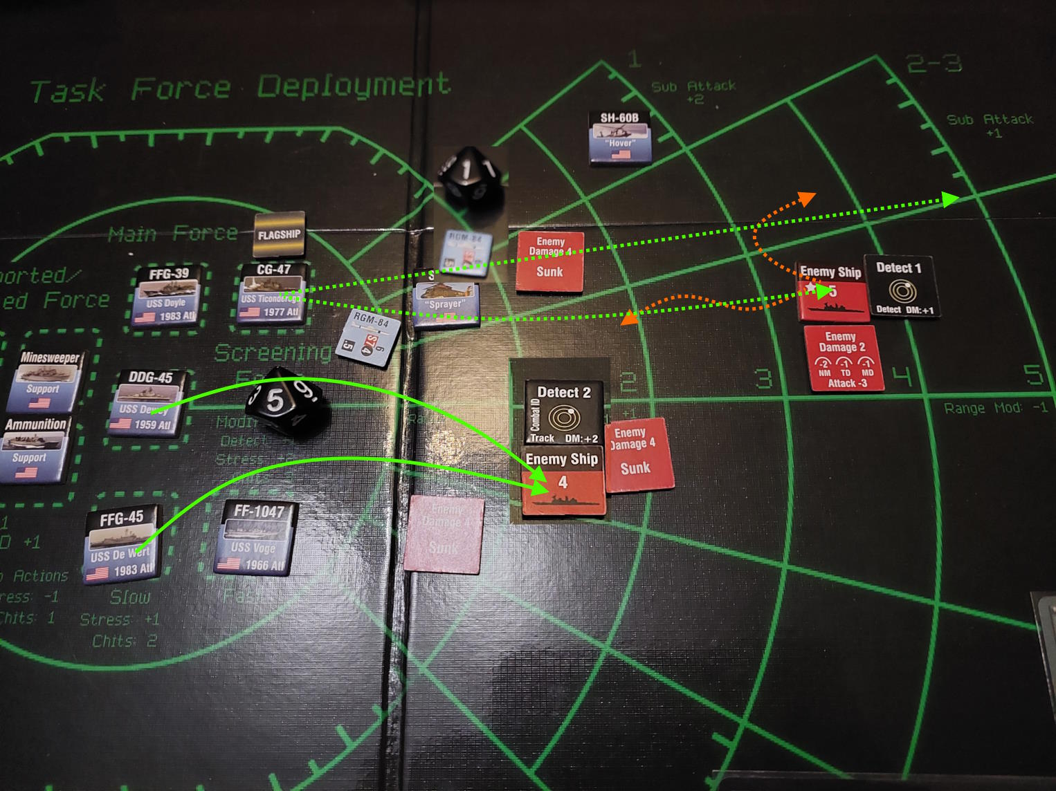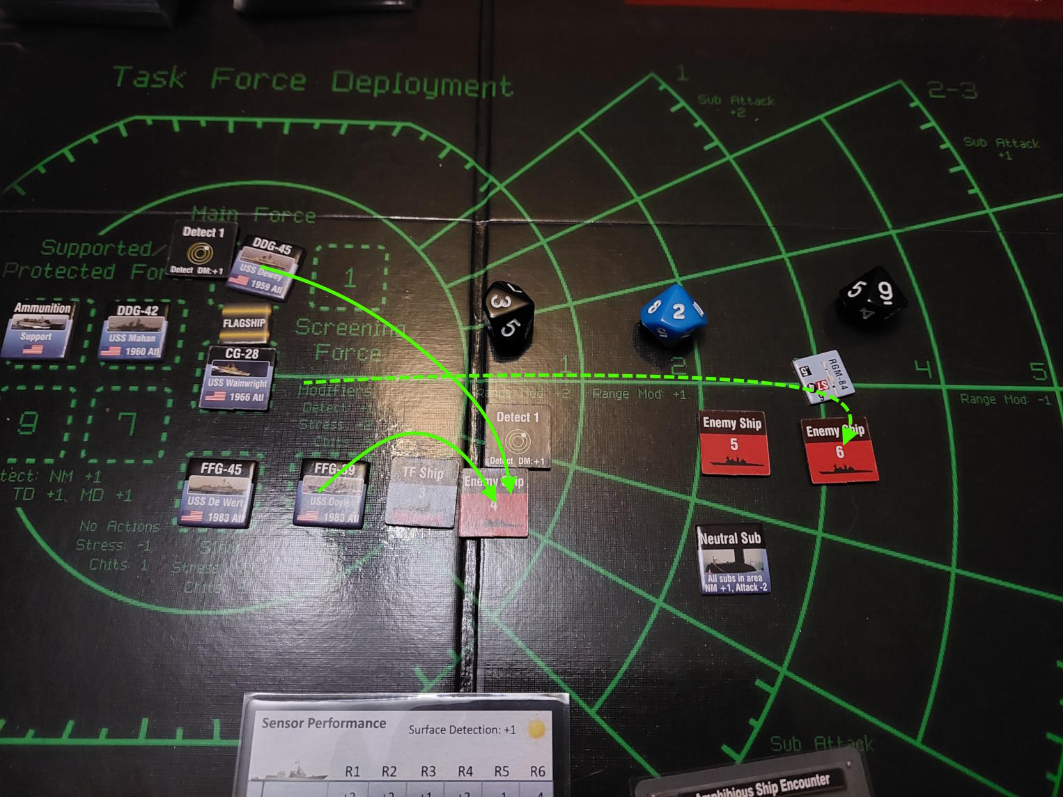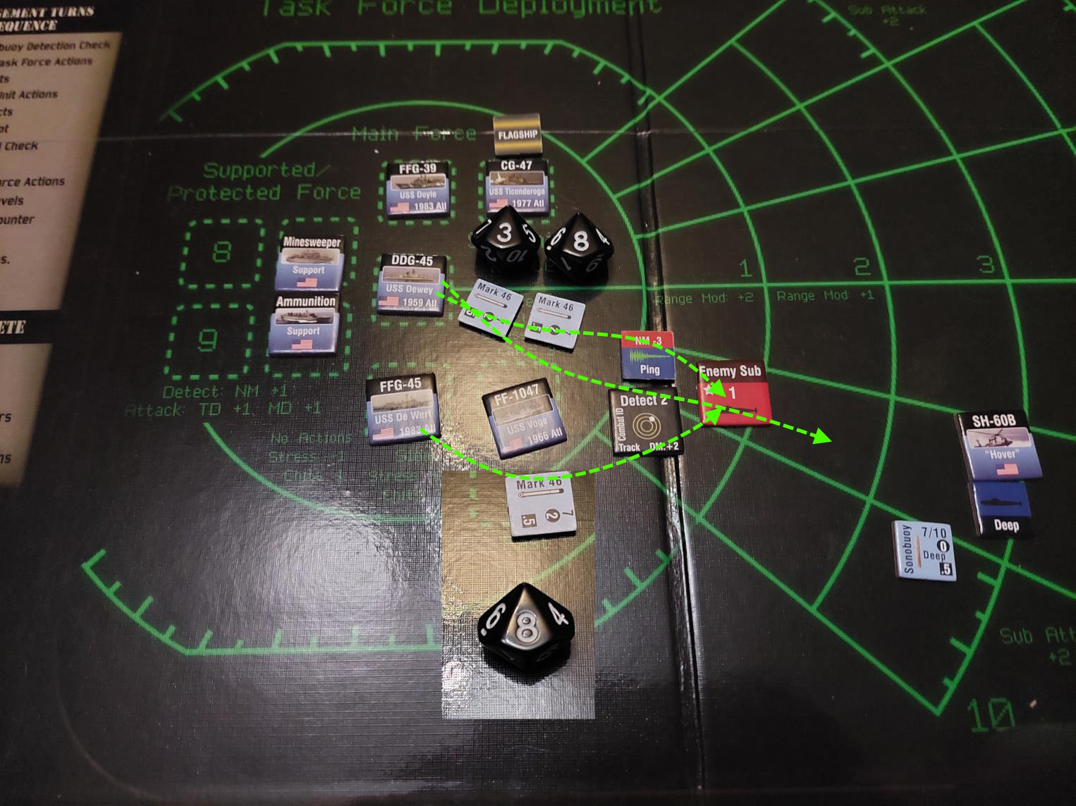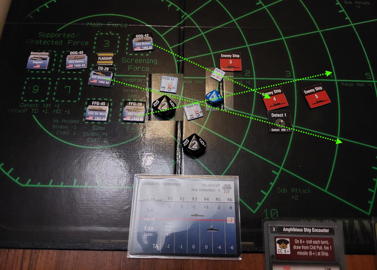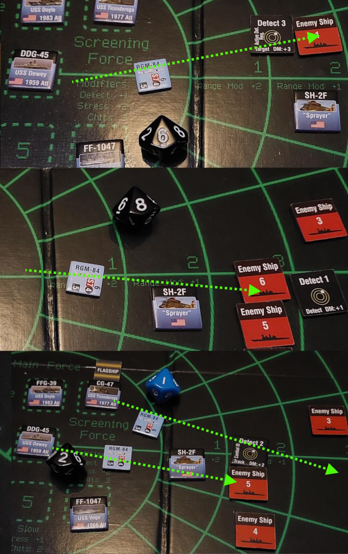 Okręt podwodny znalazł się na tyle blisko Mahama i De Werta, że zdołał wystrzelić torpedy. Gdy dwa okręty wycofywały się, pozostawiając za sobą wabie, wykryliśmy nadlatujące rakiety. USS Dewey zlokalizował okręt, który dokonał ataku i wystrzelił w tamtą stronę salwę rakiet Harpoon. Tymczasem zajęliśmy się obronę przed zmierzającym atakiem. Niestety, dwie rakiety przebiły się przez naszą obronę i ugodziły w USS Mahama, który stanął w ogniu.