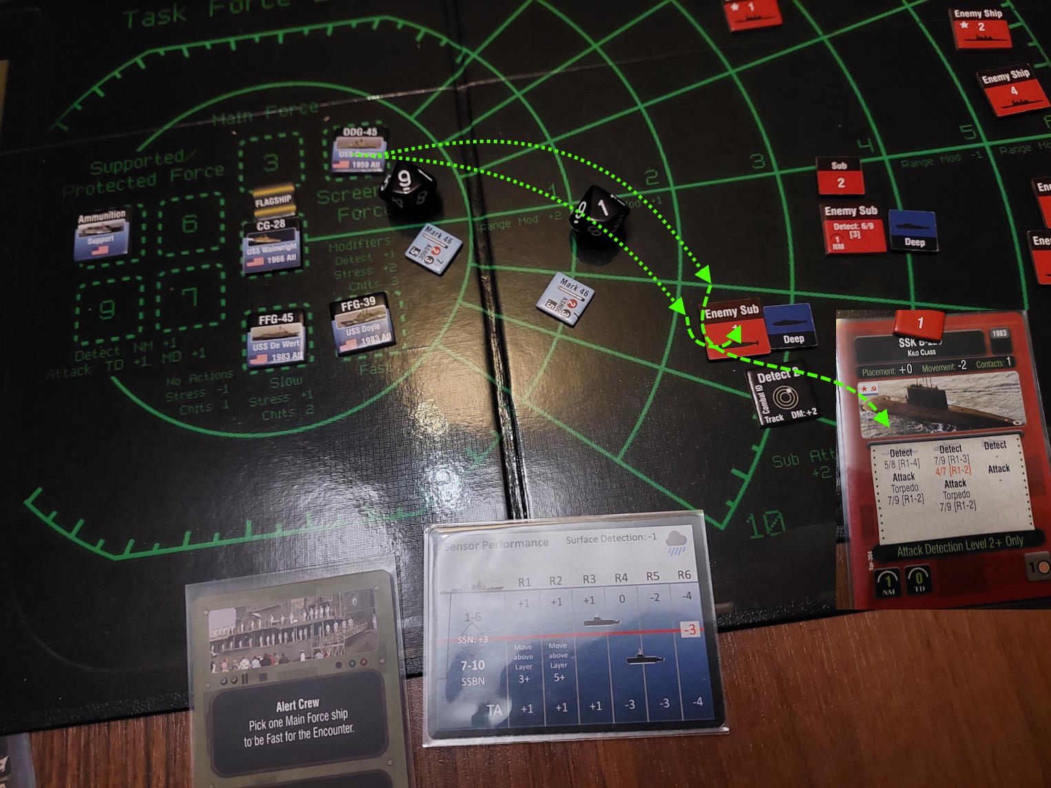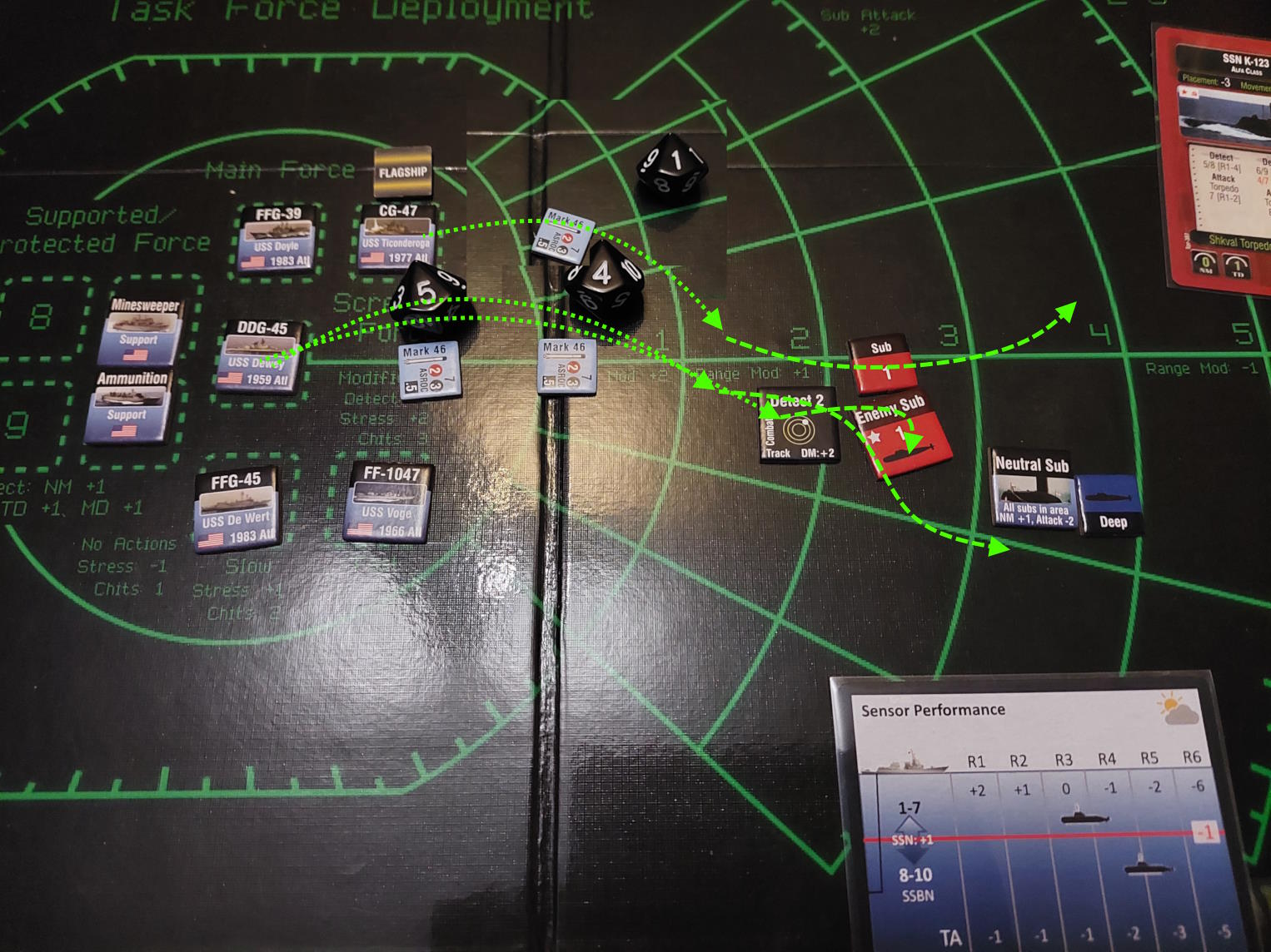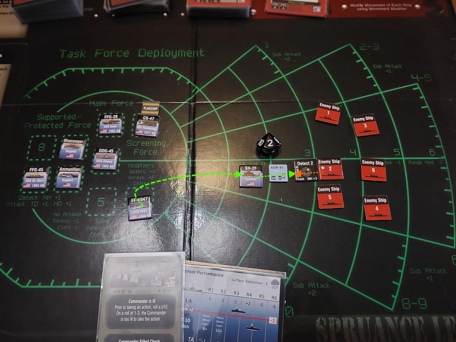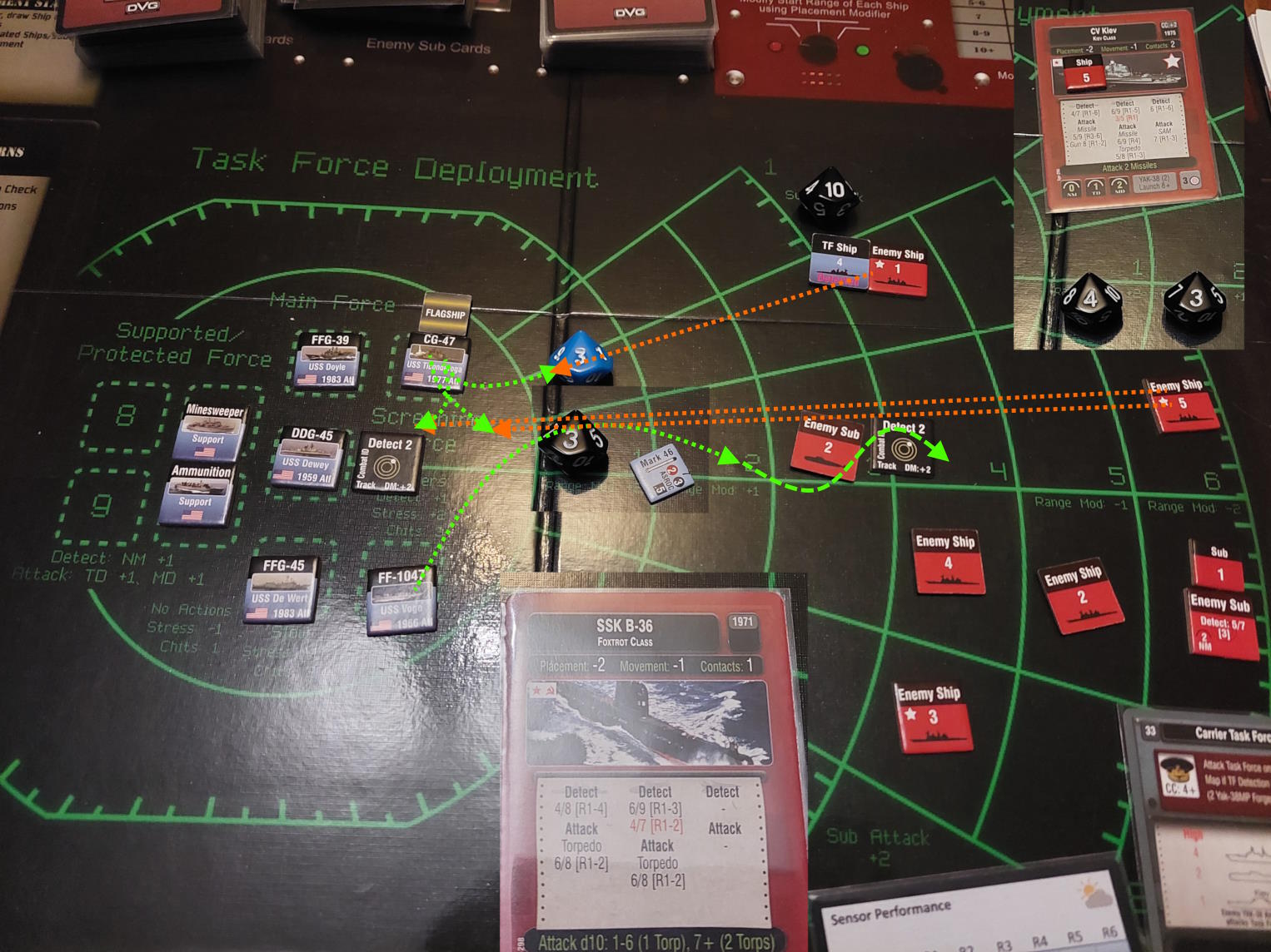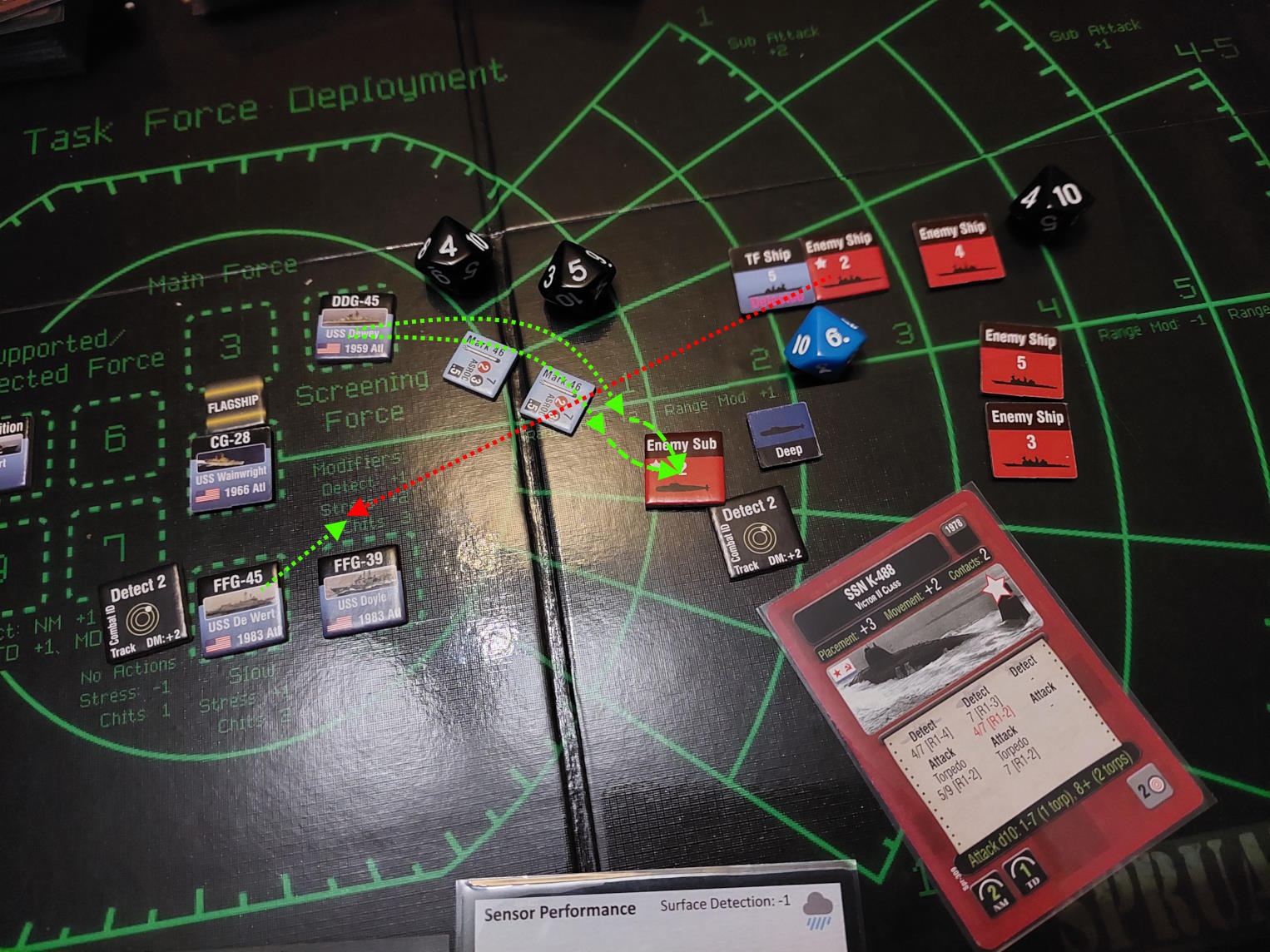 Okręt podwodny znalazł się na tyle blisko Mahama i De Werta, że zdołał wystrzelić torpedy. Gdy dwa okręty wycofywały się, pozostawiając za sobą wabie, wykryliśmy nadlatujące rakiety. USS Dewey zlokalizował okręt, który dokonał ataku i wystrzelił w tamtą stronę salwę rakiet Harpoon. Tymczasem zajęliśmy się obronę przed zmierzającym atakiem. Niestety, dwie rakiety przebiły się przez naszą obronę i ugodziły w USS Mahama, który stanął w ogniu.