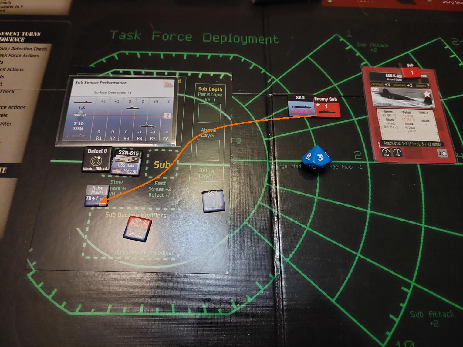 Okręt jest w pozycji "wolna". Ma premie do ukrycia, ale jego akcja jest po sowieckich. Wliczając kapitana, okręt ma 1 akcję przed sowietami i 3 akcje po nich. Alternatywnie mógłby mieć akcję przed Sowietami i premie do wykrycia nieprzyjaciela