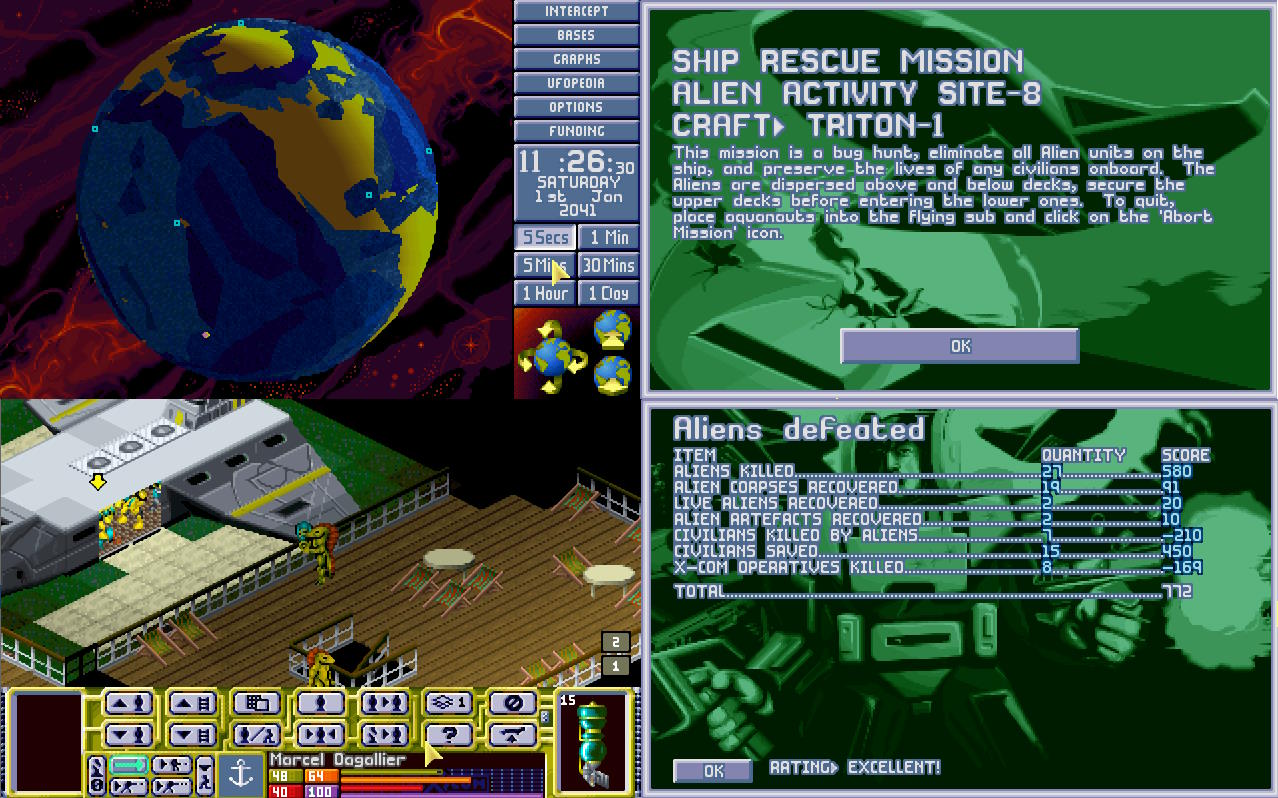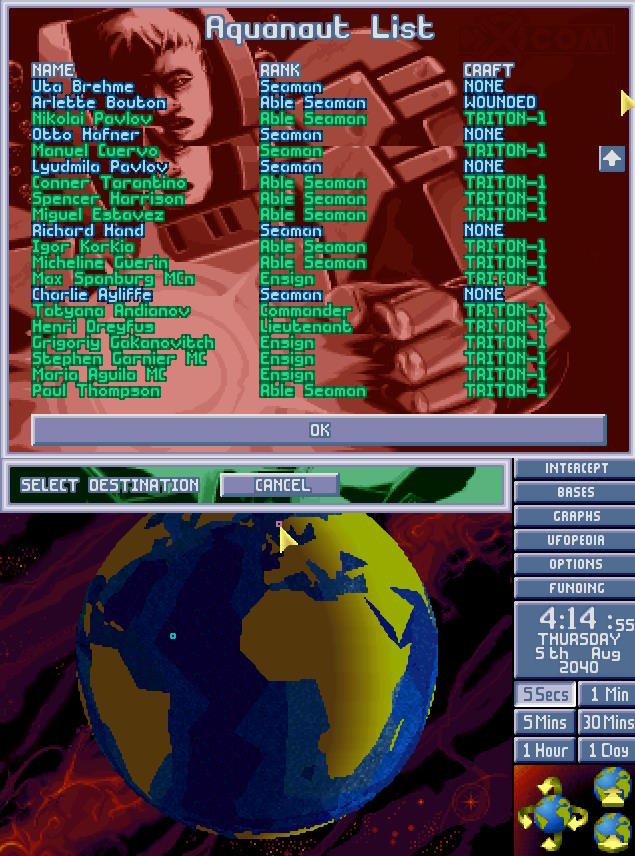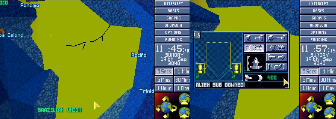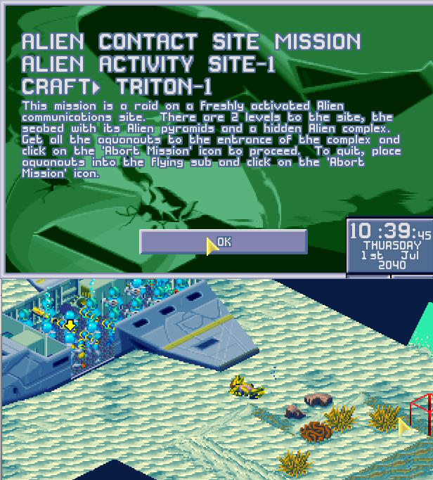 Tryton, łódź transportowa X-COM dotarła nad ranem w pobliże miejsca zatopienia, gdzie wdała się w walkę z obcymi. Dieter Hofner dostał zaszczyt bycia pierwszym Aquanautą, który zabił obcego, a Stefan Berger zdobył niechlubny zaszczyt bycia pierwszą ofiarą reaktywowanego projektu X-COM...