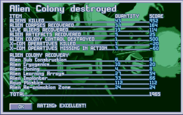 Raport który składał admirał X-COM był tym, czego komisja oczekiwała od początku wojny. Zwycięstwo. Wielki Śniący jest pokonany. Jednak w raporcie znalazła się informacja o ilości poległych w wojnie... w tym cały oddział Lewiatan...