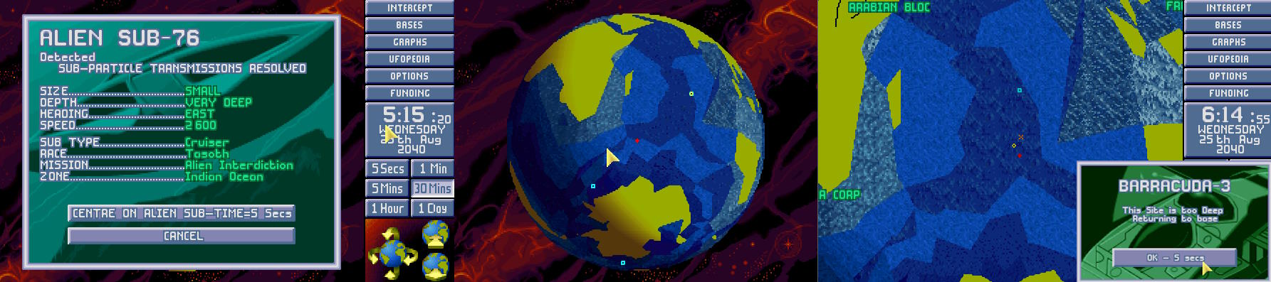 W bazie na oceanie indyjskim otworzono nowy zestaw sensorów, gdy napłynęły meldunki, że na Morzu Jawajskim zauważono USO. Dowództwo ponownie nakazało wysłać Barracudy 03 i 04 na przechwycenie. O 17:30 sensory dalekiego zasięgu z bazy X-COM numer 2 wykryły USO, gdy to wzbiło się w powietrze, aby przelecieć nad Indonezją. Barracuda 03, jako znajdująca się najbliżej miała największe szanse na przechwycenie nieprzyjaciela.