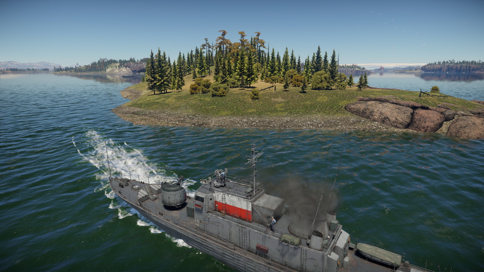 Schowałem się za wyspą (przed niszczycielem, co rzucił mnie się w oczy naprzeciwko) i strzelamy... Gdy był 5km ode mnie, odezwała się także i 40mm..