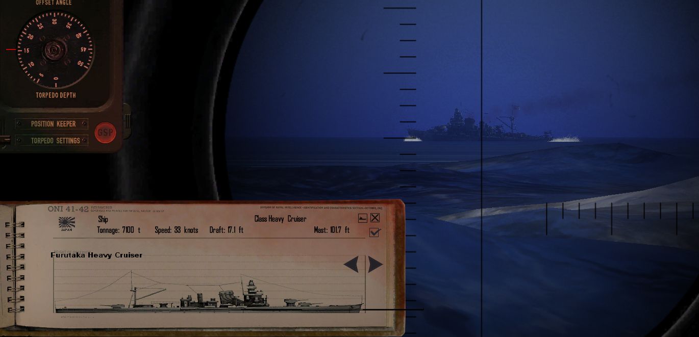 Podchodzę bliżej. Duże fale uniemożliwiają osiągnięcie pełnej prędkości, ale zarazem pozwalają pozostać niewykrytym dla sonarów wroga. Zanurzamy okręt i podchodzimy. Cel to 3 ciężkie krążowniki klasy Furutaka w asyście niszczycieli.