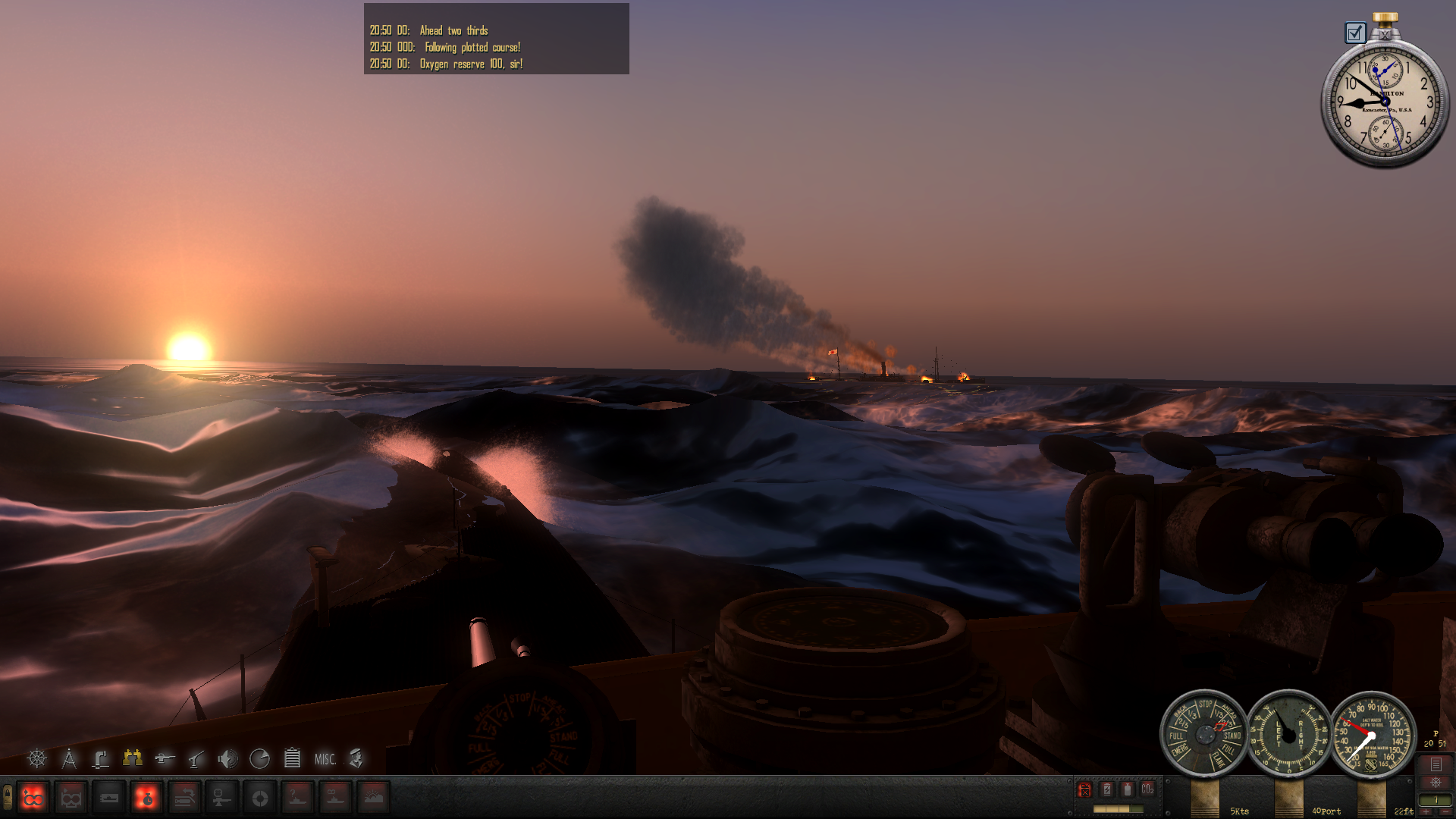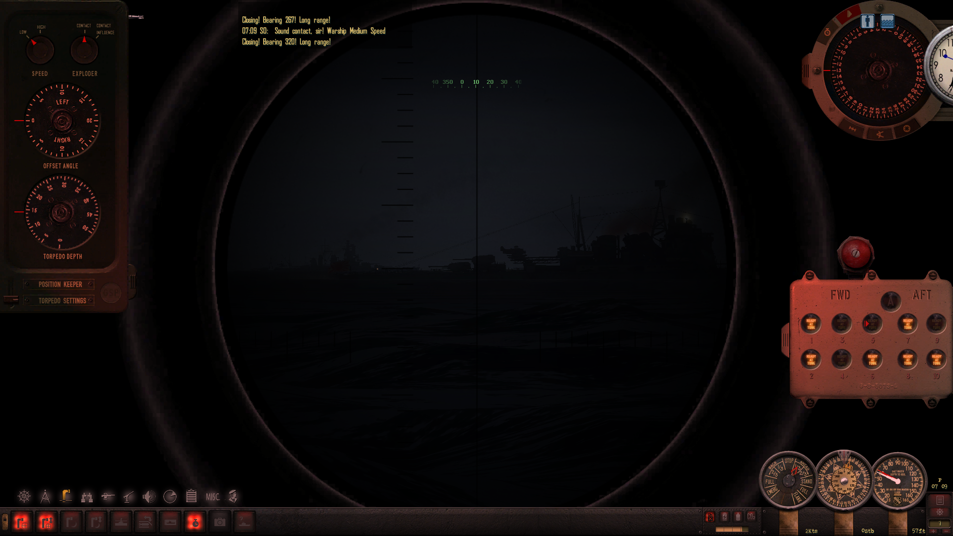 Około 6:30 podchodzimy w zanurzeniu pod konwój. Mimo że zbliża się świt, to na zewnątrz czarna noc - nie widać absolutnie niczego, mam wrażenie że oko peryskopu wciąż "siedzi" w wodzie. Za kilkanaście minut powinno zacząć świtać co - mam nadzieję - umożliwi nam atak.