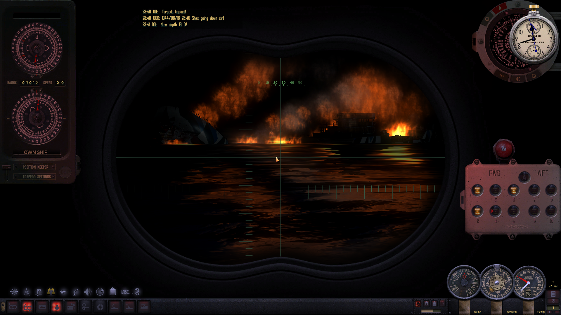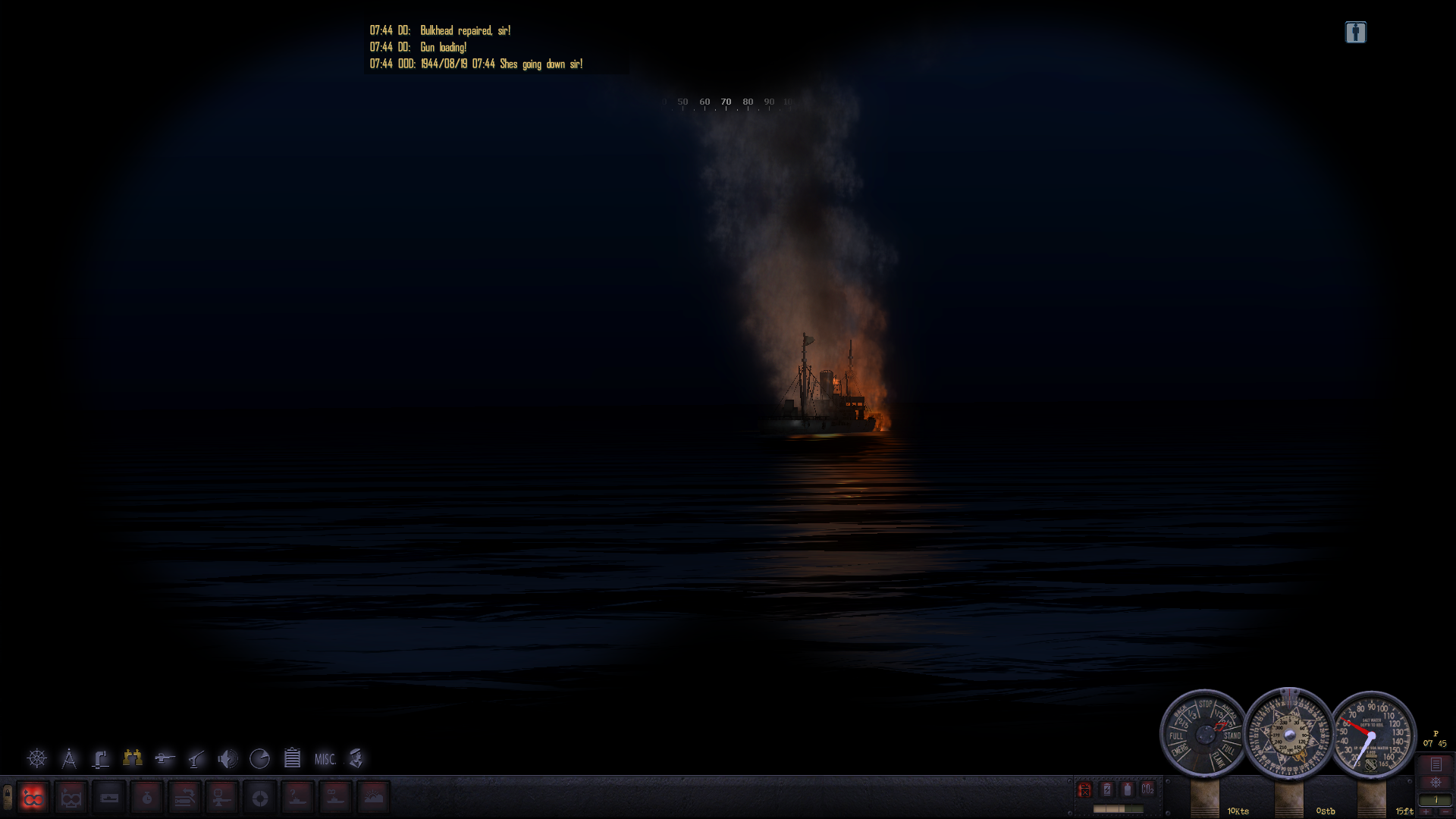 Dwa celne strzały w rufę nie zatrzymują go - cel zaczyna uciekać. Ścigam go po powierzchni przy 5 metrowych falach, lecz po kilku minutach ku mojemu zadowoleniu cel zatrzymuje się. Kolejny strzał... i pudło. Strzelam znowu z poprawką prędkości - torpeda w celu. Strzelam ostatnią torpedą i Nagara Maru idzie w końcu na dno.