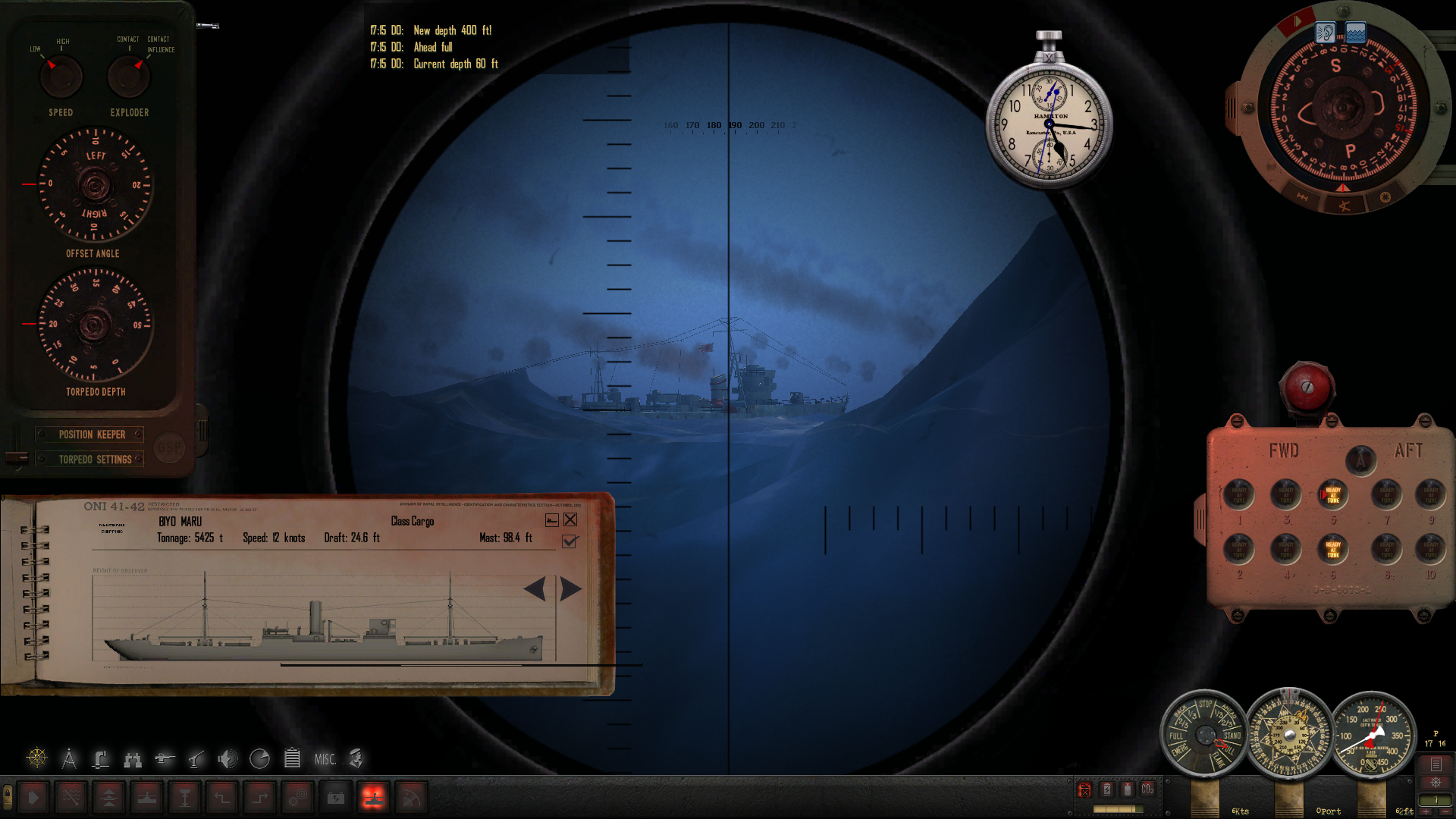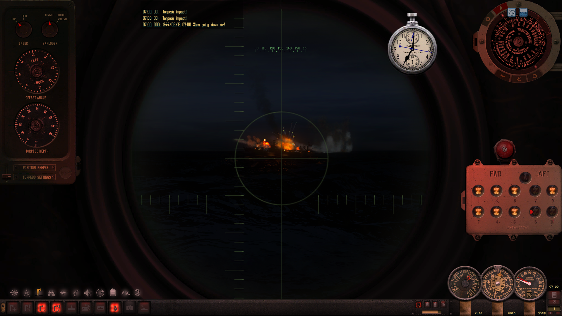 Około 6:30 podchodzimy w zanurzeniu pod konwój. Mimo że zbliża się świt, to na zewnątrz czarna noc - nie widać absolutnie niczego, mam wrażenie że oko peryskopu wciąż "siedzi" w wodzie. Za kilkanaście minut powinno zacząć świtać co - mam nadzieję - umożliwi nam atak.