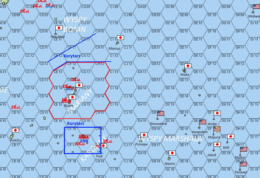 -Sama misja Snooka nie wymaga zbyt wielkiej odprawy. Znów będzie to operowanie w pobliżu Truk i wysp archipelagu Karolin. Obszar znacie. Różnica jest jednak w związku z operacją Zbieracz. Zanim okręt dotrze do strefy operacja będzie w toku i może lekko wpłynąć na taktykę. Otóż, na północ od strefy Snooka jest korytarz dla wycofujących się i idących na patrole okrętów, a dalej jest pole przeznaczone dla floty. Celem operacji jest opanowanie głównych wysp Marianów, zaczynając od Saipanu. Podejrzewamy, że to spowoduje, że zamiast wzmacniania osłabionego Truk, Japończycy skupią się raczej tam, wysyłając pod Karoliny tylko konwoje. To też jest ważny cel. No i koniec patrolu będzie inny. Główna baza dla okrętów podwodnych Pacyfiku została przesunięta na Majuro na Marshallach i tam wracają wszystkie nieuszkodzone okręty. W przypadku potrzeby poważnych napraw, okręty kierują się tutaj, do Pearl. To tyle jeżeli chodzi o główne założenia... Jakieś pytania, czy możemy omówić konkretne sprawy związane z patrolem i operacją Zbieracz?