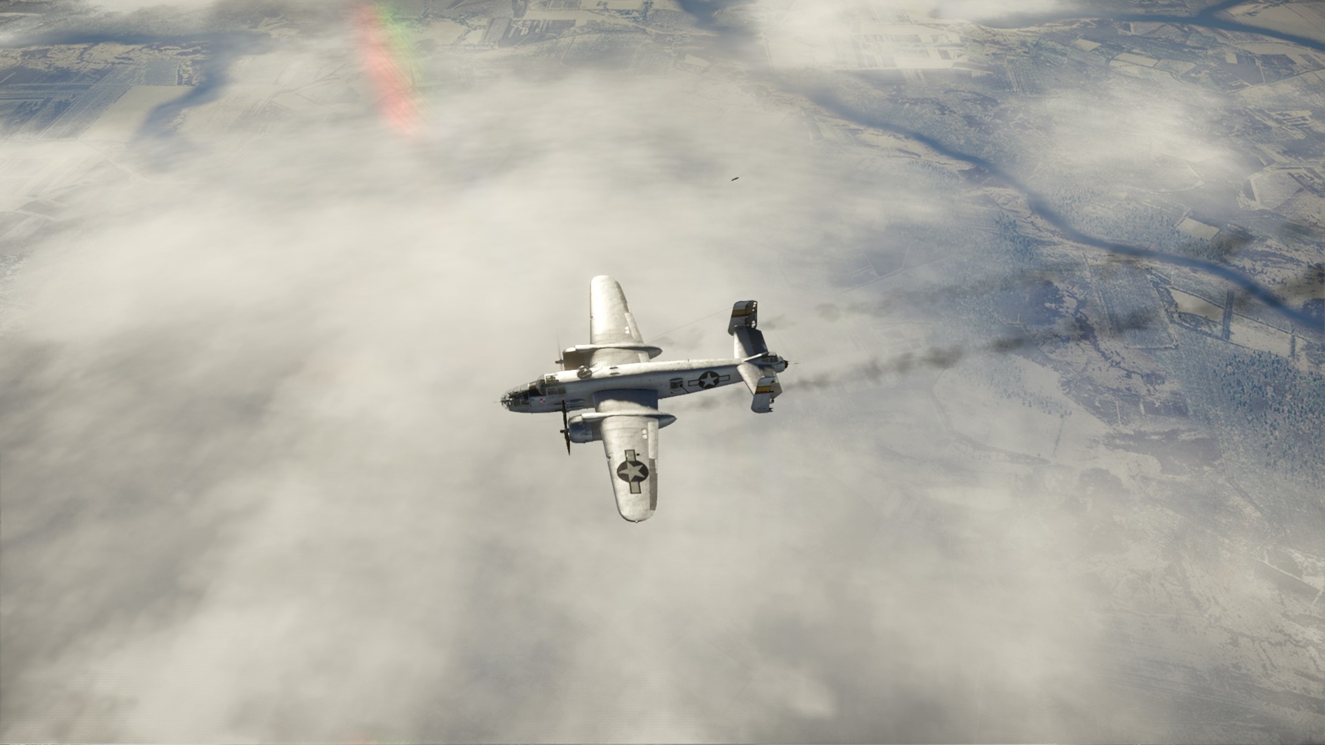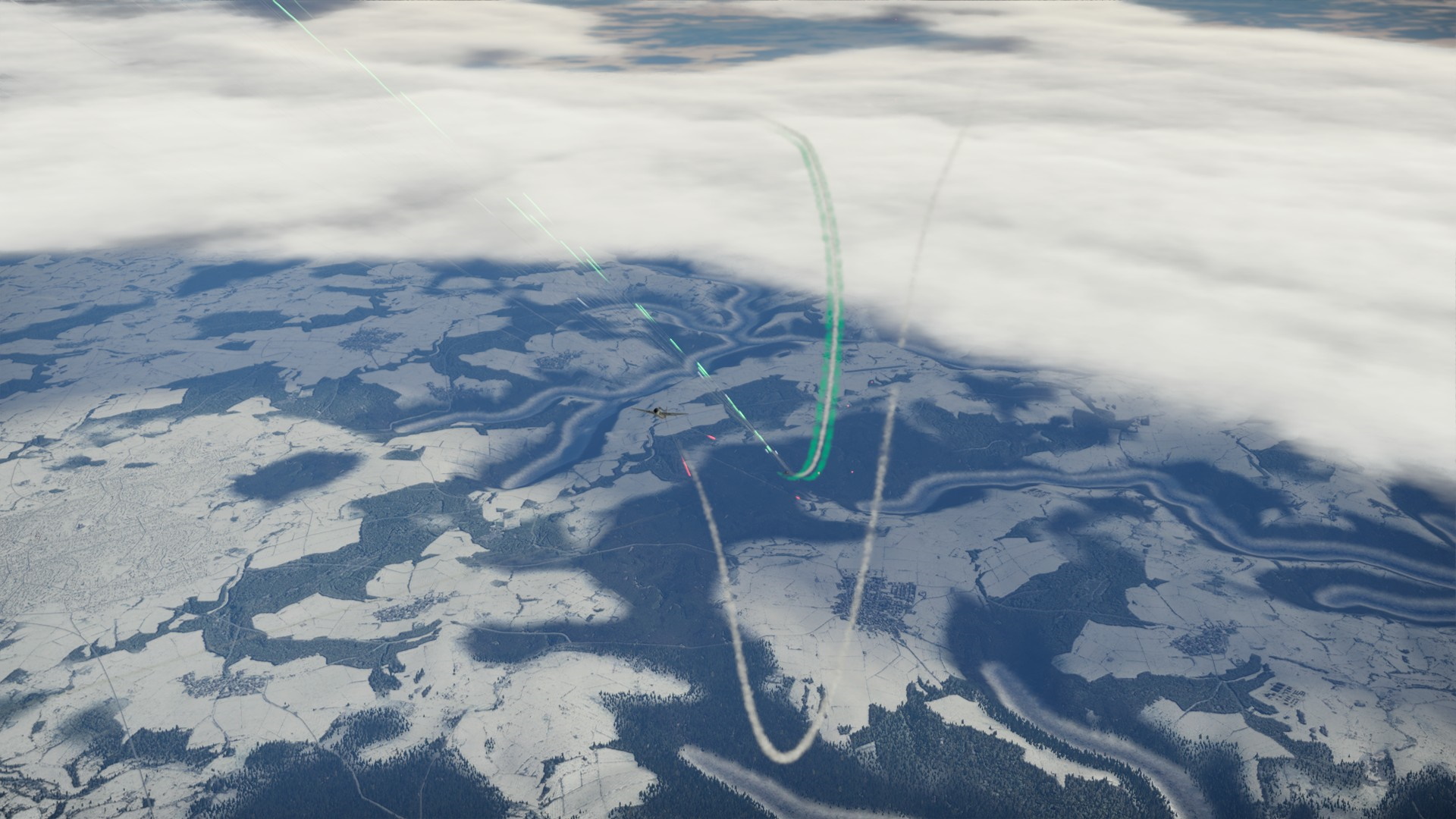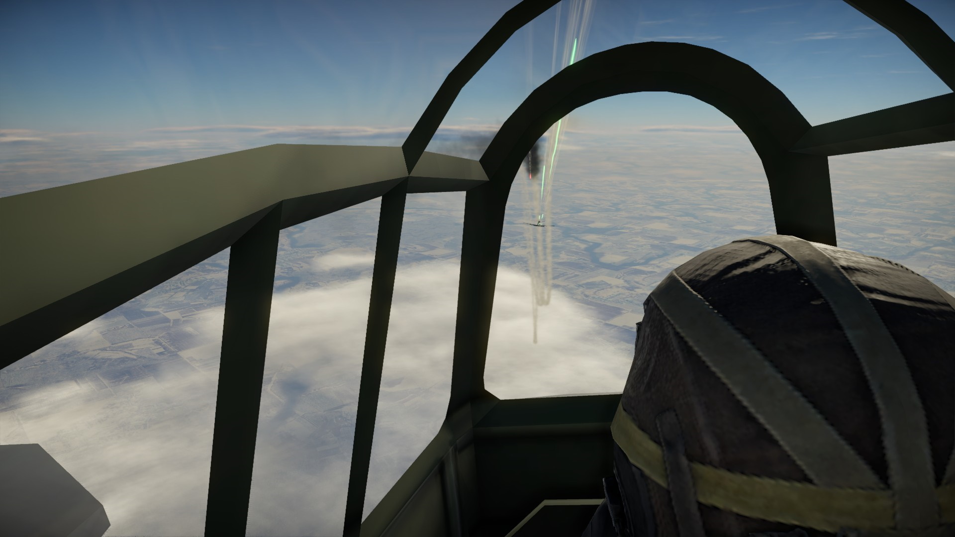 Zawróciliśmy i Pete otworzył ogień, a prawie natychmiast wrogi myśliwiec wypuścił dym... zielony. Albo trafiliśmy w zbiornik w kolorowym gazem, albo wrogi pilot chciał pokazać, że dla niego to będzie tylko zabawa.