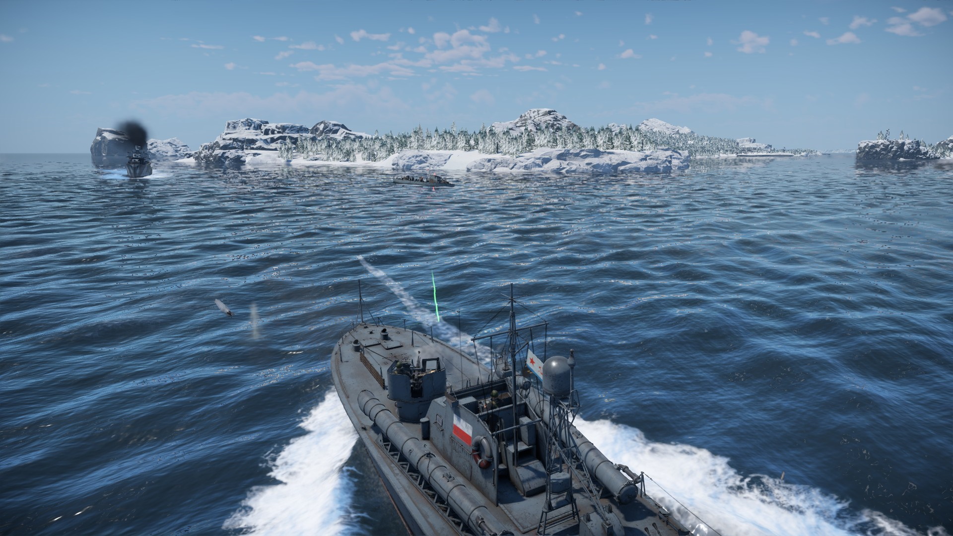 Jednocześnie strzelając się z kutrem, odpaliłem torpedy.... Ale wróg dostrzegł mój manewr...